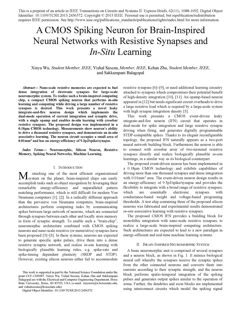 A CMOS Spiking Neuron for Brain-Inspired Neural Networks with Resistive