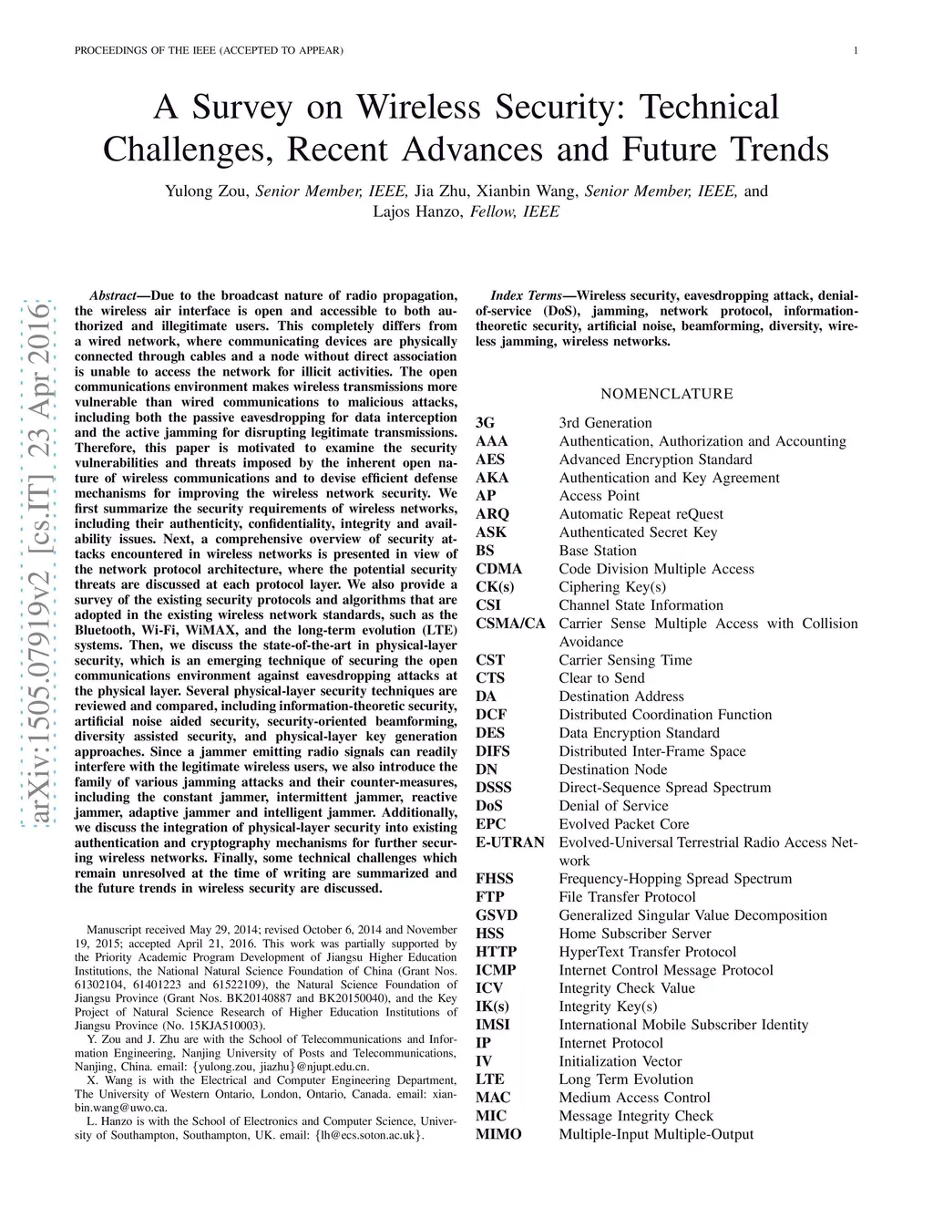 A Survey on Wireless Security: Technical Challenges, Recent Advances and