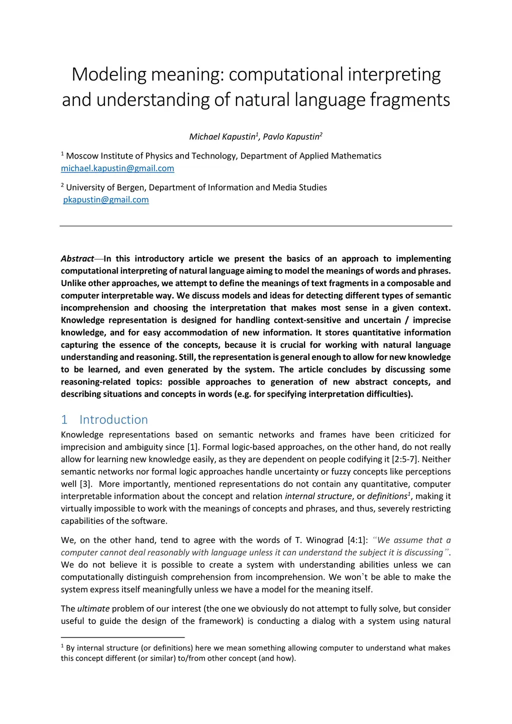 In this introductory article we present the basics of an approach to implementing computational interpreting of natural language aiming to model the meanings of words and phrases. Unlike other approaches, we attempt to define the meanings of text fragments in a composable and computer interpretable way. We discuss models and ideas for detecting different types of semantic incomprehension and choosing the interpretation that makes most sense in a given context. Knowledge representation is designed for handling context-sensitive and uncertain / imprecise knowledge, and for easy accommodation of new information. It stores quantitative information capturing the essence of the concepts, because it is crucial for working with natural language understanding and reasoning. Still, the representation is general enough to allow for new knowledge to be learned, and even generated by the system. The article concludes by discussing some reasoning-related topics: possible approaches to generation of new abstract concepts, and describing situations and concepts in words (e.g. for specifying interpretation difficulties).