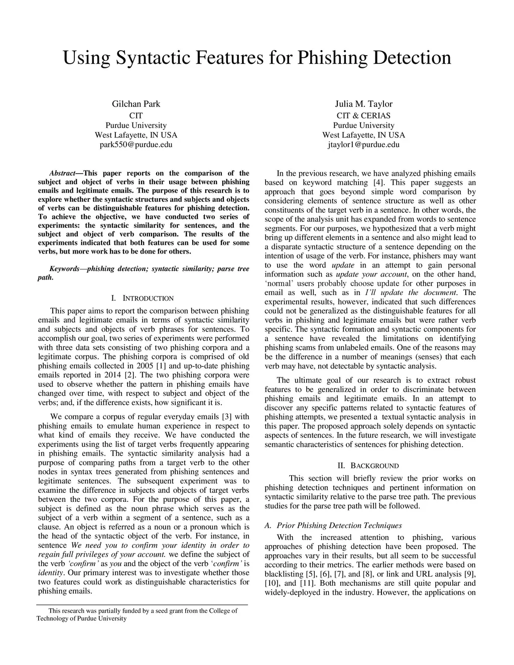 This paper reports on the comparison of the subject and object of verbs in their usage between phishing emails and legitimate emails. The purpose of this research is to explore whether the syntactic structures and subjects and objects of verbs can be distinguishable features for phishing detection. To achieve the objective, we have conducted two series of experiments: the syntactic similarity for sentences, and the subject and object of verb comparison. The results of the experiments indicated that both features can be used for some verbs, but more work has to be done for others.