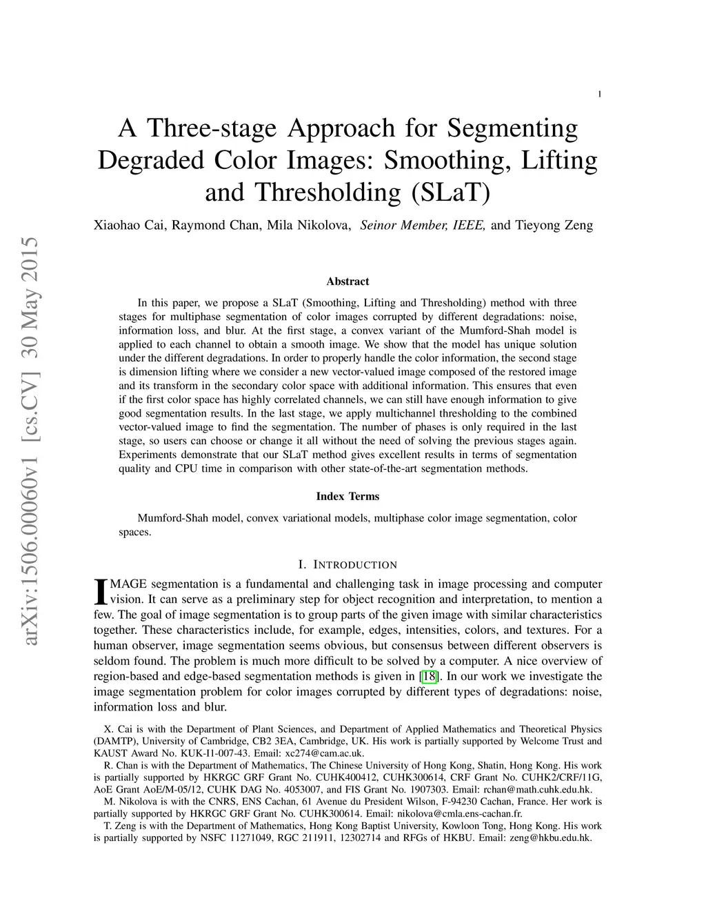 A Three-stage Approach for Segmenting Degraded Color Images: Smoothing,