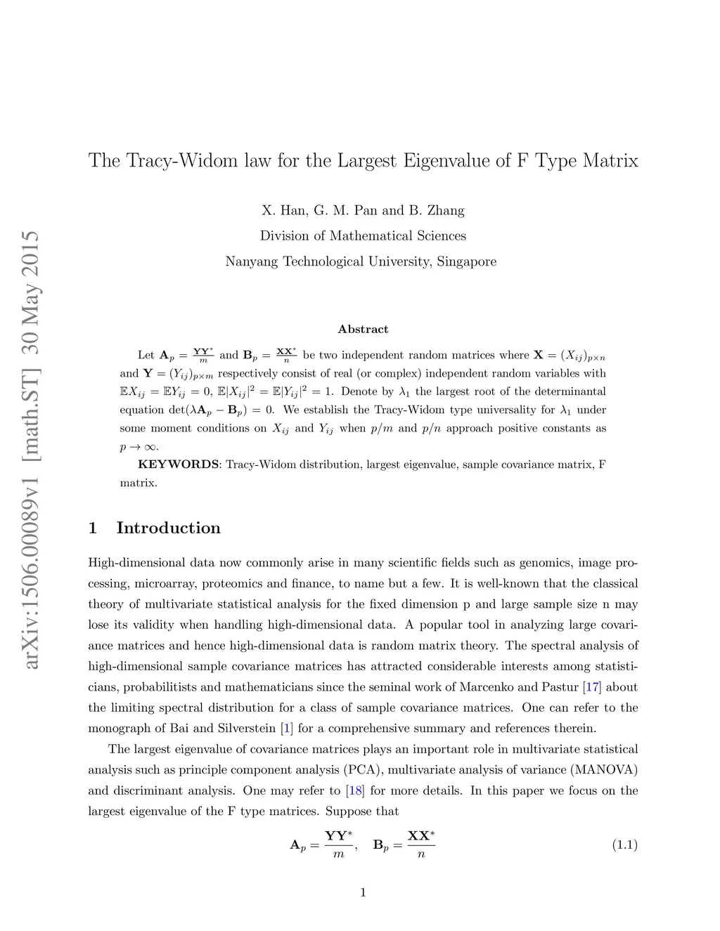 largest root of the determinantal equation det(λAp−Bp)=0. We establish the Tracy-Widom type universality