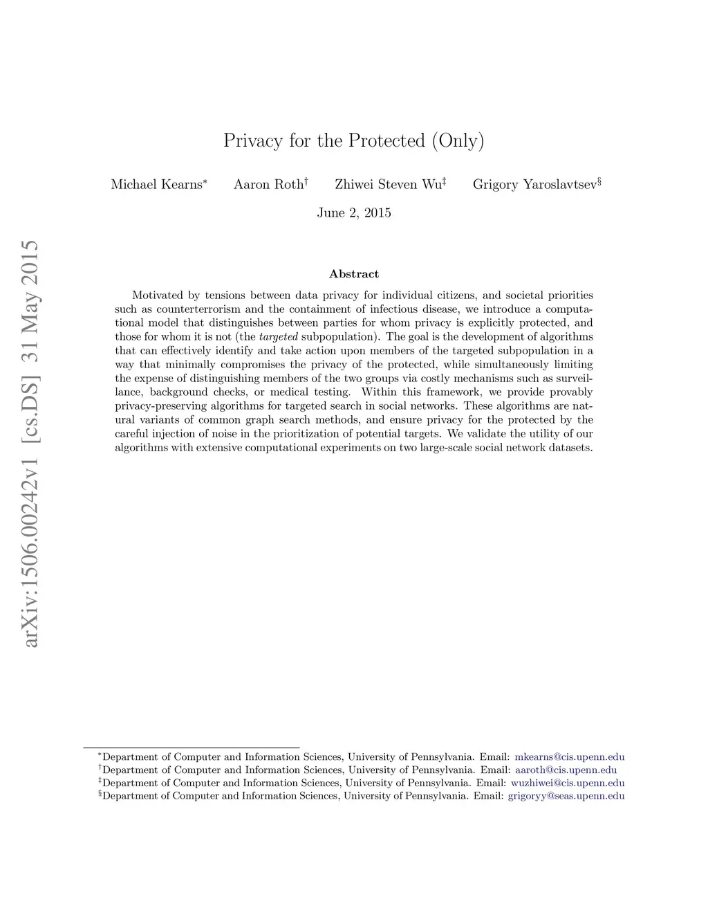 Motivated by tensions between data privacy for individual citizens, and societal priorities such as counterterrorism and the containment of infectious disease, we introduce a computational model that distinguishes between parties for whom privacy is explicitly protected, and those for whom it is not (the targeted subpopulation). The goal is the development of algorithms that can effectively identify and take action upon members of the targeted subpopulation in a way that minimally compromises the privacy of the protected, while simultaneously limiting the expense of distinguishing members of the two groups via costly mechanisms such as surveillance, background checks, or medical testing. Within this framework, we provide provably privacy-preserving algorithms for targeted search in social networks. These algorithms are natural variants of common graph search methods, and ensure privacy for the protected by the careful injection of noise in the prioritization of potential targets. We validate the utility of our algorithms with extensive computational experiments on two large-scale social network datasets.