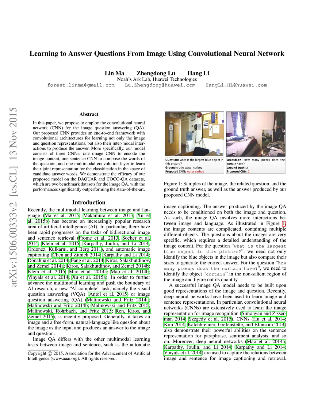 In this paper, we propose to employ the convolutional neural network (CNN) for the image question answering (QA). Our proposed CNN provides an end-to-end framework with convolutional architectures for learning not only the image and question representations, but also their inter-modal interactions to produce the answer. More specifically, our model consists of three CNNs: one image CNN to encode the image content, one sentence CNN to compose the words of the question, and one multimodal convolution layer to learn their joint representation for the classification in the space of candidate answer words. We demonstrate the efficacy of our proposed model on the DAQUAR and COCO-QA datasets, which are two benchmark datasets for the image QA, with the performances significantly outperforming the state-of-the-art.