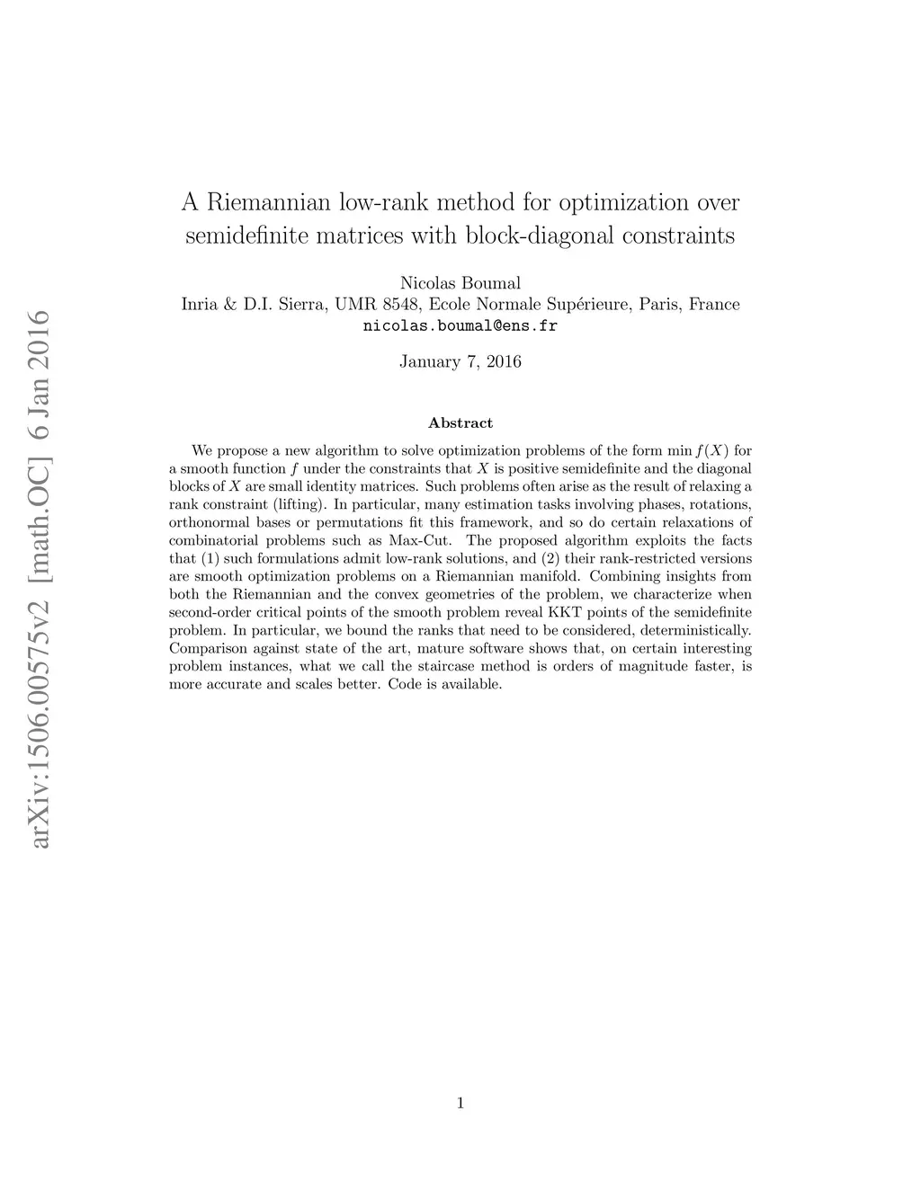 We propose a new algorithm to solve optimization problems of the form for a smooth function under the constraints that is positive semidefinite and the diagonal blocks of are small identity matrices. Such problems often arise as the result of relaxing a rank constraint (lifting). In particular, many estimation tasks involving phases, rotations, orthonormal bases or permutations fit in this framework, and so do certain relaxations of combinatorial problems such as Max-Cut. The proposed algorithm exploits the facts that (1) such formulations admit low-rank solutions, and (2) their rank-restricted versions are smooth optimization problems on a Riemannian manifold. Combining insights from both the Riemannian and the convex geometries of the problem, we characterize when second-order critical points of the smooth problem reveal KKT points of the semidefinite problem. We compare against state of the art, mature software and find that, on certain interesting problem instances, what we call the staircase method is orders of magnitude faster, is more accurate and scales better. Code is available.
