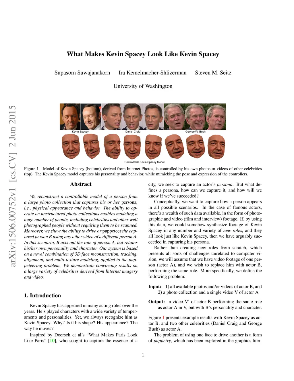 We reconstruct a controllable model of a person from a large photo collection that captures his or her {\em persona}, i.e., physical appearance and behavior. The ability to operate on unstructured photo collections enables modeling a huge number of people, including celebrities and other well photographed people without requiring them to be scanned. Moreover, we show the ability to drive or {\em puppeteer} the captured person B using any other video of a different person A. In this scenario, B acts out the role of person A, but retains his/her own personality and character. Our system is based on a novel combination of 3D face reconstruction, tracking, alignment, and multi-texture modeling, applied to the puppeteering problem. We demonstrate convincing results on a large variety of celebrities derived from Internet imagery and video.