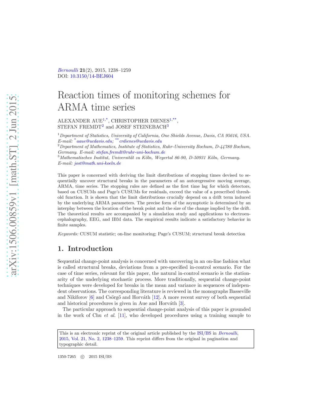 This paper is concerned with deriving the limit distributions of stopping times devised to sequentially uncover structural breaks in the parameters of an autoregressive moving average, ARMA, time series. The stopping rules are defined as the first time lag for which detectors, based on CUSUMs and Page's CUSUMs for residuals, exceed the value of a prescribed threshold function. It is shown that the limit distributions crucially depend on a drift term induced by the underlying ARMA parameters. The precise form of the asymptotic is determined by an interplay between the location of the break point and the size of the change implied by the drift. The theoretical results are accompanied by a simulation study and applications to electroencephalography, EEG, and IBM data. The empirical results indicate a satisfactory behavior in finite samples.
