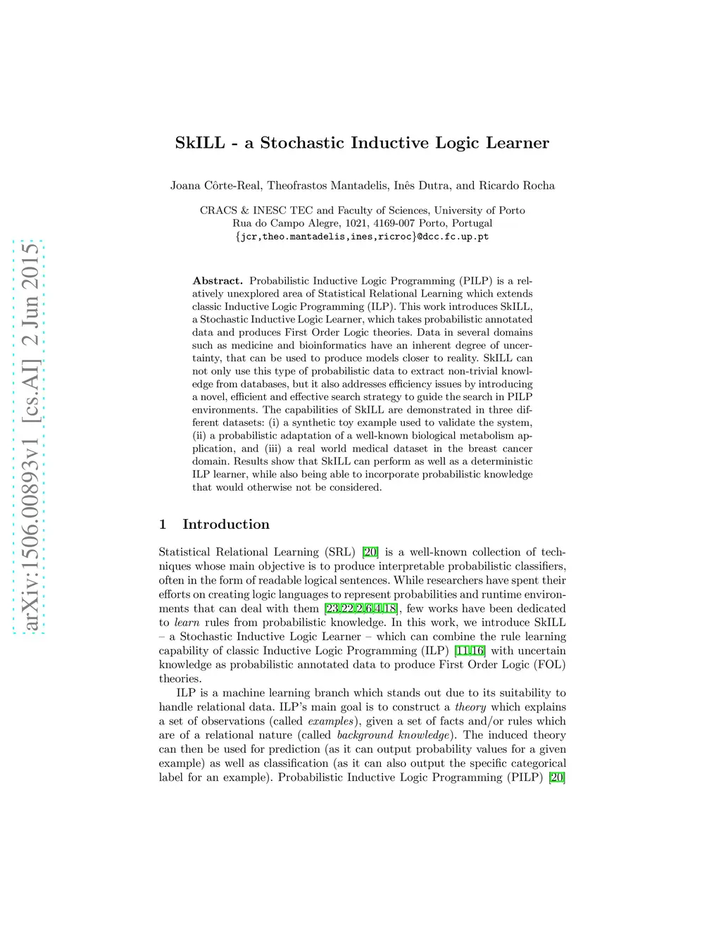 Probabilistic Inductive Logic Programming (PILP) is a rel- atively unexplored area of Statistical Relational Learning which extends classic Inductive Logic Programming (ILP). This work introduces SkILL, a Stochastic Inductive Logic Learner, which takes probabilistic annotated data and produces First Order Logic theories. Data in several domains such as medicine and bioinformatics have an inherent degree of uncer- tainty, that can be used to produce models closer to reality. SkILL can not only use this type of probabilistic data to extract non-trivial knowl- edge from databases, but it also addresses efficiency issues by introducing a novel, efficient and effective search strategy to guide the search in PILP environments. The capabilities of SkILL are demonstrated in three dif- ferent datasets: (i) a synthetic toy example used to validate the system, (ii) a probabilistic adaptation of a well-known biological metabolism ap- plication, and (iii) a real world medical dataset in the breast cancer domain. Results show that SkILL can perform as well as a deterministic ILP learner, while also being able to incorporate probabilistic knowledge that would otherwise not be considered.