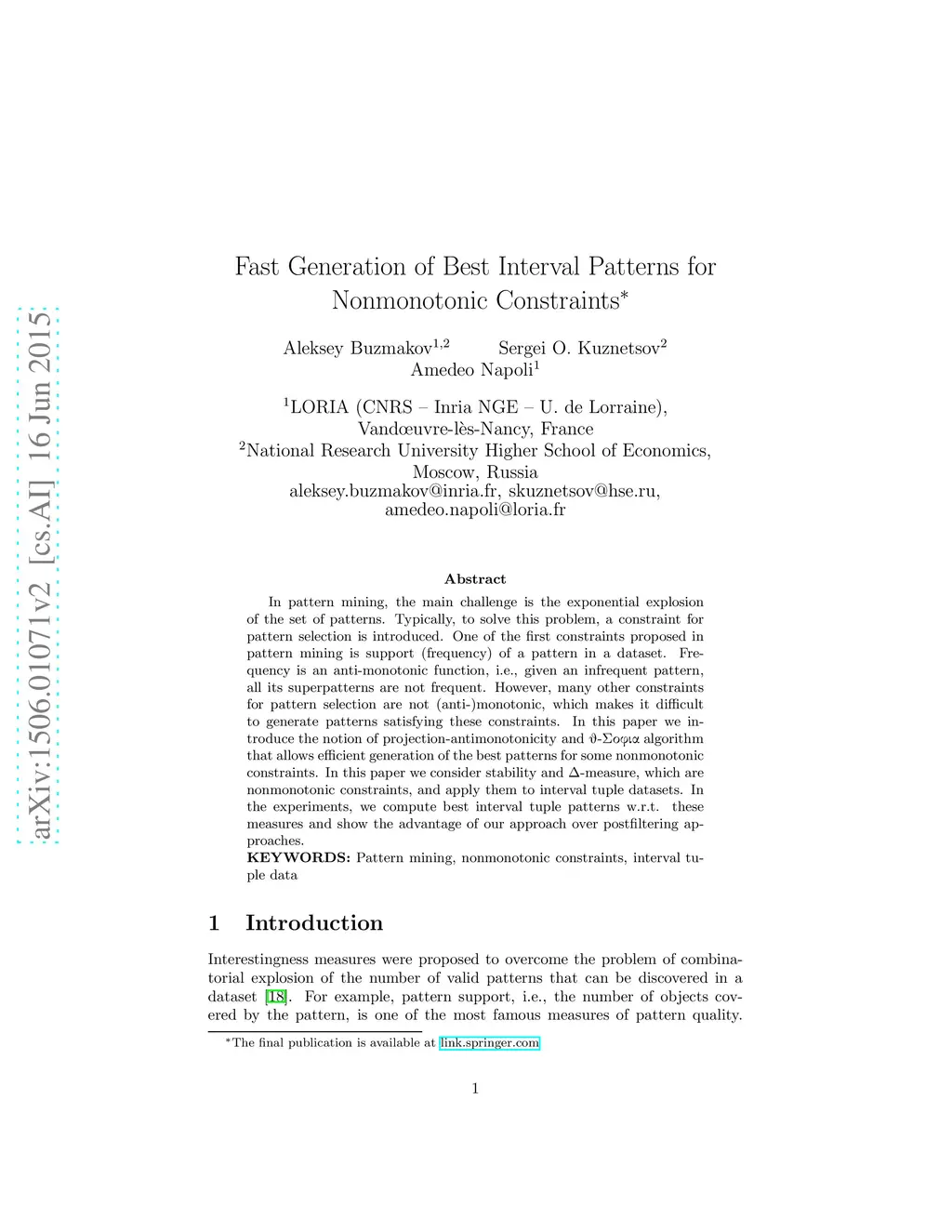 In pattern mining, the main challenge is the exponential explosion of the set of patterns. Typically, to solve this problem, a constraint for pattern selection is introduced. One of the first constraints proposed in pattern mining is support (frequency) of a pattern in a dataset. Frequency is an anti-monotonic function, i.e., given an infrequent pattern, all its superpatterns are not frequent. However, many other constraints for pattern selection are not (anti-)monotonic, which makes it difficult to generate patterns satisfying these constraints. In this paper we introduce the notion of projection-antimonotonicity and - algorithm that allows efficient generation of the best patterns for some nonmonotonic constraints. In this paper we consider stability and -measure, which are nonmonotonic constraints, and apply them to interval tuple datasets. In the experiments, we compute best interval tuple patterns w.r.t. these measures and show the advantage of our approach over postfiltering approaches. KEYWORDS: Pattern mining, nonmonotonic constraints, interval tuple data