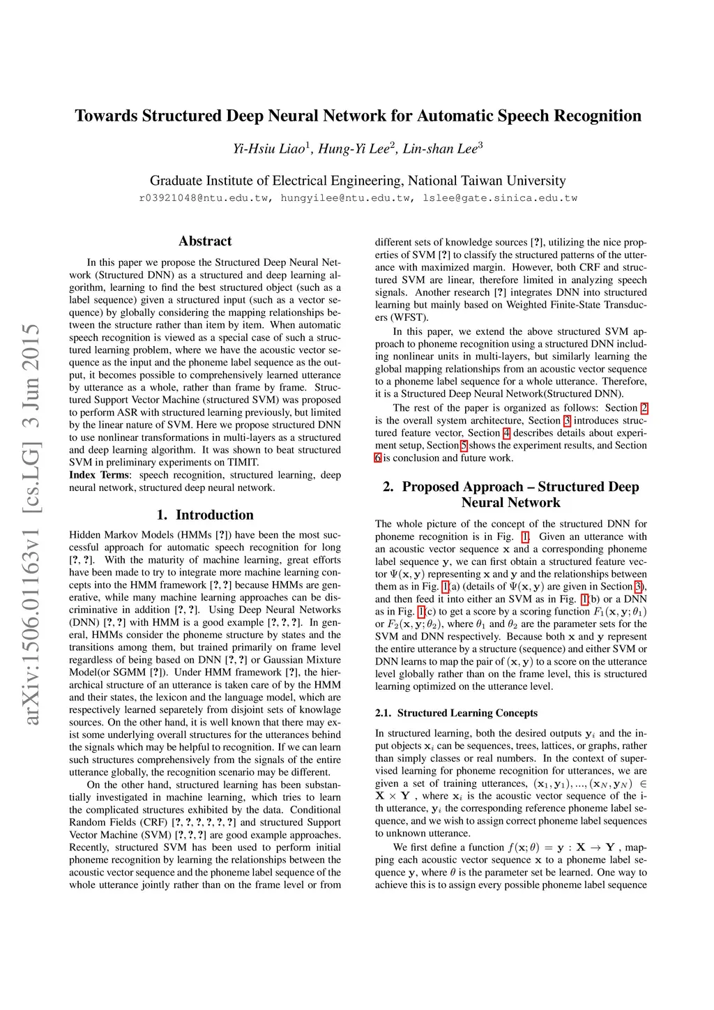 In this paper we propose the Structured Deep Neural Network (Structured DNN) as a structured and deep learning algorithm, learning to find the best structured object (such as a label sequence) given a structured input (such as a vector sequence) by globally considering the mapping relationships between the structure rather than item by item. When automatic speech recognition is viewed as a special case of such a structured learning problem, where we have the acoustic vector sequence as the input and the phoneme label sequence as the output, it becomes possible to comprehensively learned utterance by utterance as a whole, rather than frame by frame. Structured Support Vector Machine (structured SVM) was proposed to perform ASR with structured learning previously, but limited by the linear nature of SVM. Here we propose structured DNN to use nonlinear transformations in multi-layers as a structured and deep learning algorithm. It was shown to beat structured SVM in preliminary experiments on TIMIT.