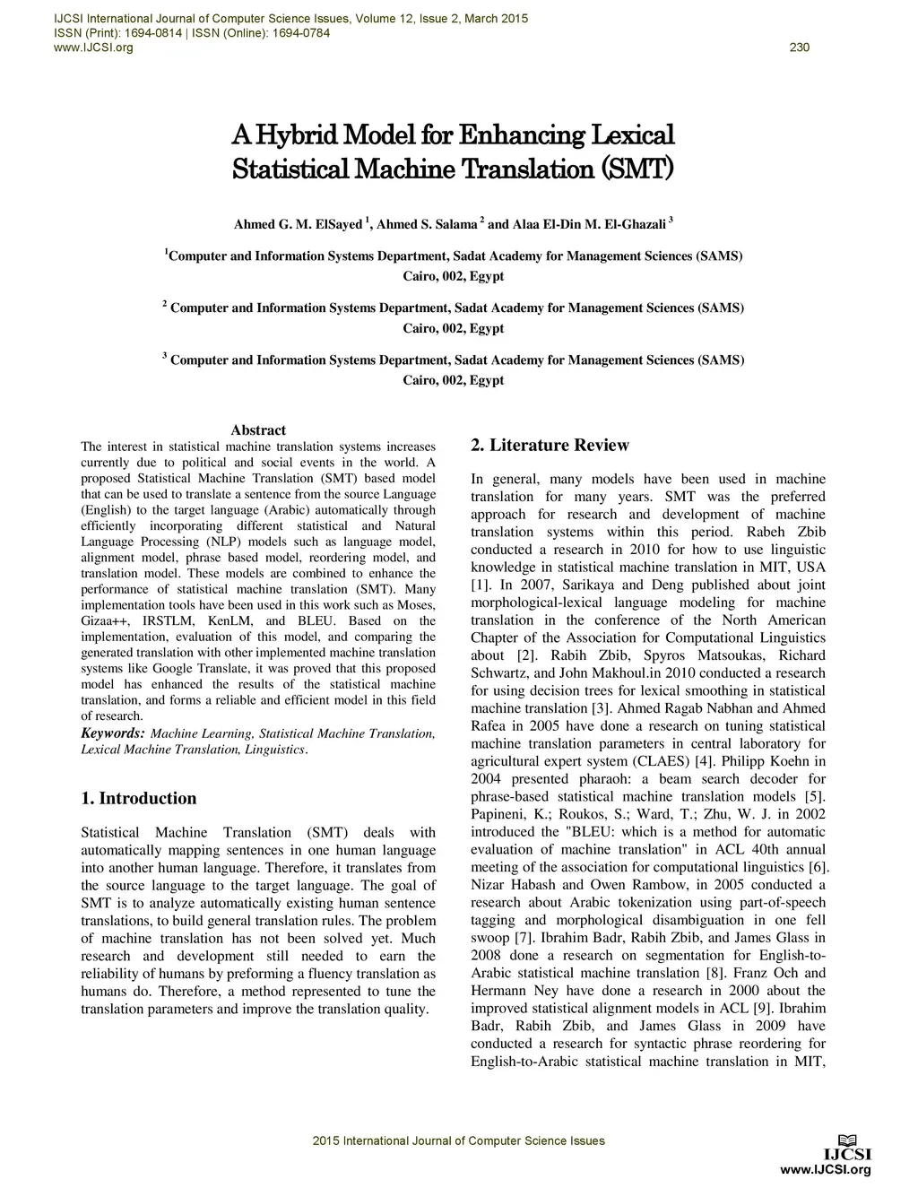 The interest in statistical machine translation systems increases currently due to political and social events in the world. A proposed Statistical Machine Translation (SMT) based model that can be used to translate a sentence from the source Language (English) to the target language (Arabic) automatically through efficiently incorporating different statistical and Natural Language Processing (NLP) models such as language model, alignment model, phrase based model, reordering model, and translation model. These models are combined to enhance the performance of statistical machine translation (SMT). Many implementation tools have been used in this work such as Moses, Gizaa++, IRSTLM, KenLM, and BLEU. Based on the implementation, evaluation of this model, and comparing the generated translation with other implemented machine translation systems like Google Translate, it was proved that this proposed model has enhanced the results of the statistical machine translation, and forms a reliable and efficient model in this field of research.