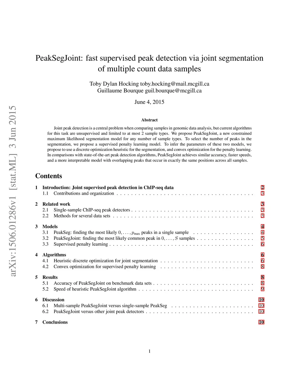 Joint peak detection is a central problem when comparing samples in genomic data analysis, but current algorithms for this task are unsupervised and limited to at most 2 sample types. We propose PeakSegJoint, a new constrained maximum likelihood segmentation model for any number of sample types. To select the number of peaks in the segmentation, we propose a supervised penalty learning model. To infer the parameters of these two models, we propose to use a discrete optimization heuristic for the segmentation, and convex optimization for the penalty learning. In comparisons with state-of-the-art peak detection algorithms, PeakSegJoint achieves similar accuracy, faster speeds, and a more interpretable model with overlapping peaks that occur in exactly the same positions across all samples.