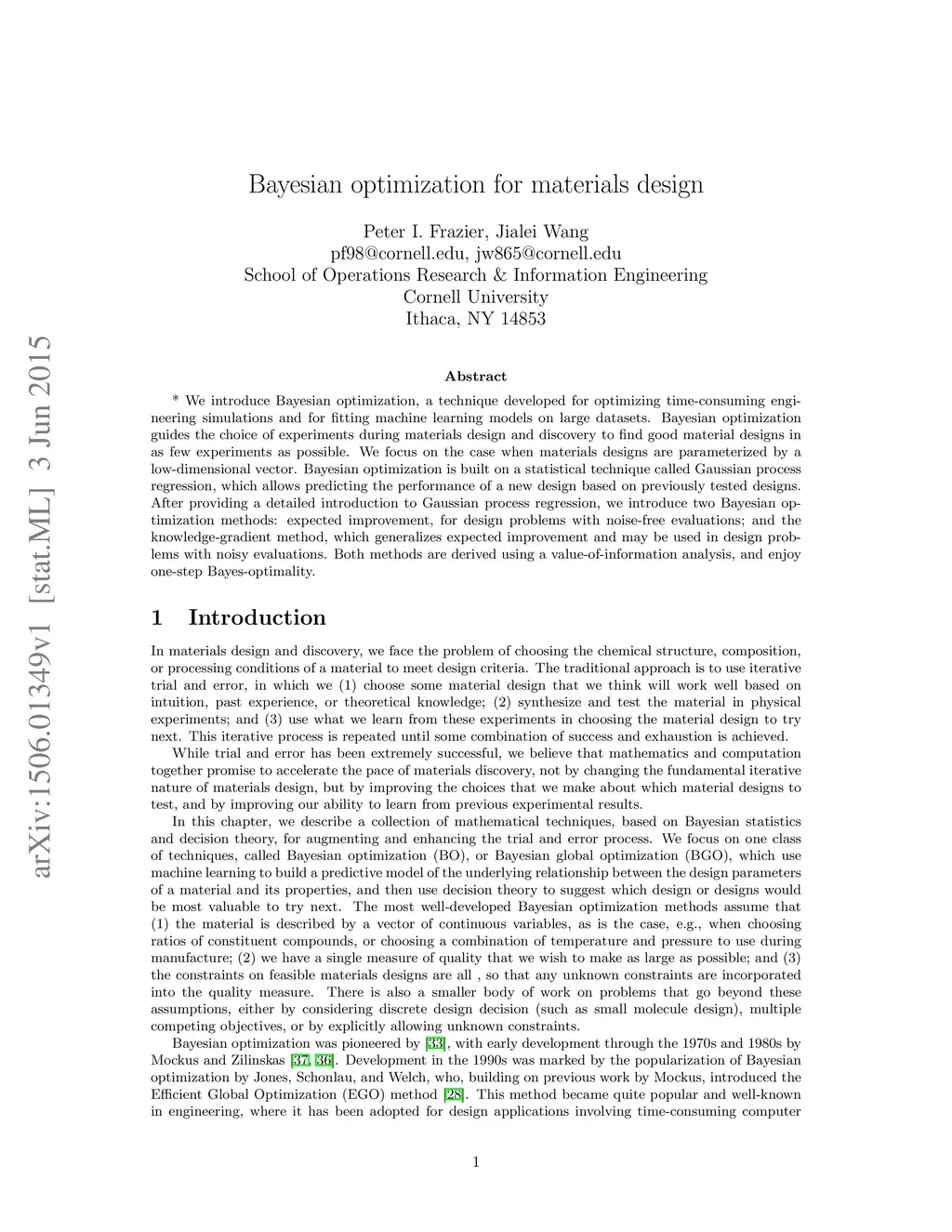 We introduce Bayesian optimization, a technique developed for optimizing time-consuming engineering simulations and for fitting machine learning models on large datasets. Bayesian optimization guides the choice of experiments during materials design and discovery to find good material designs in as few experiments as possible. We focus on the case when materials designs are parameterized by a low-dimensional vector. Bayesian optimization is built on a statistical technique called Gaussian process regression, which allows predicting the performance of a new design based on previously tested designs. After providing a detailed introduction to Gaussian process regression, we introduce two Bayesian optimization methods: expected improvement, for design problems with noise-free evaluations; and the knowledge-gradient method, which generalizes expected improvement and may be used in design problems with noisy evaluations. Both methods are derived using a value-of-information analysis, and enjoy one-step Bayes-optimality.