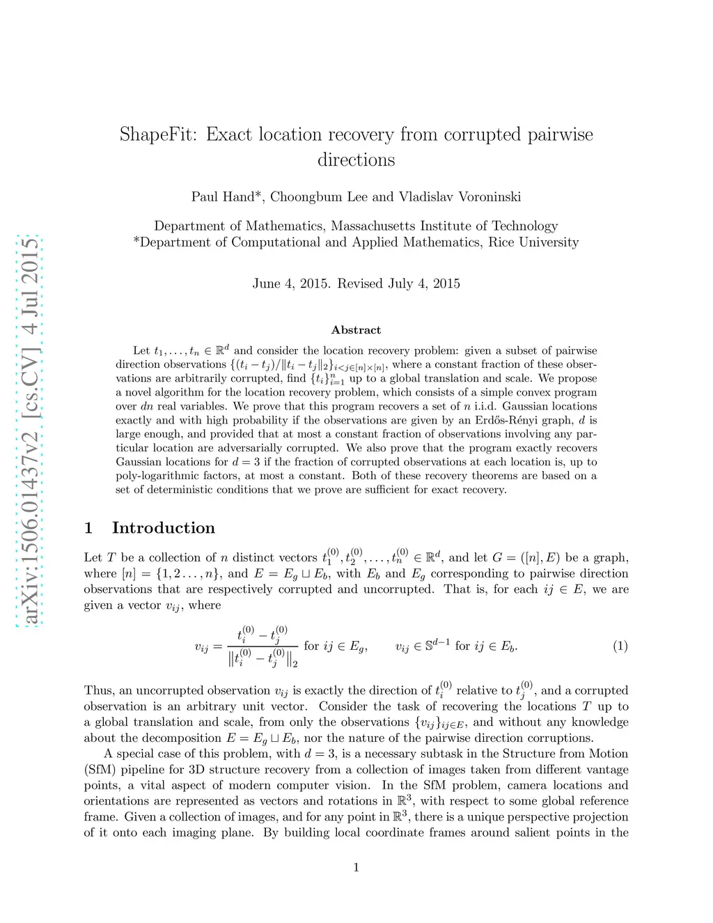 ShapeFit: Exact location recovery from corrupted pairwise directions