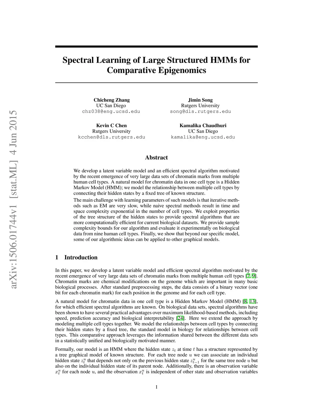 We develop a latent variable model and an efficient spectral algorithm motivated by the recent emergence of very large data sets of chromatin marks from multiple human cell types. A natural model for chromatin data in one cell type is a Hidden Markov Model (HMM); we model the relationship between multiple cell types by connecting their hidden states by a fixed tree of known structure. The main challenge with learning parameters of such models is that iterative methods such as EM are very slow, while naive spectral methods result in time and space complexity exponential in the number of cell types. We exploit properties of the tree structure of the hidden states to provide spectral algorithms that are more computationally efficient for current biological datasets. We provide sample complexity bounds for our algorithm and evaluate it experimentally on biological data from nine human cell types. Finally, we show that beyond our specific model, some of our algorithmic ideas can be applied to other graphical models.
