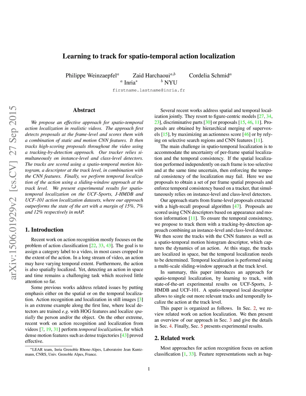 We propose an effective approach for spatio-temporal action localization in realistic videos. The approach first detects proposals at the frame-level and scores them with a combination of static and motion CNN features. It then tracks high-scoring proposals throughout the video using a tracking-by-detection approach. Our tracker relies simultaneously on instance-level and class-level detectors. The tracks are scored using a spatio-temporal motion histogram, a descriptor at the track level, in combination with the CNN features. Finally, we perform temporal localization of the action using a sliding-window approach at the track level. We present experimental results for spatio-temporal localization on the UCF-Sports, J-HMDB and UCF-101 action localization datasets, where our approach outperforms the state of the art with a margin of 15%, 7% and 12% respectively in mAP.