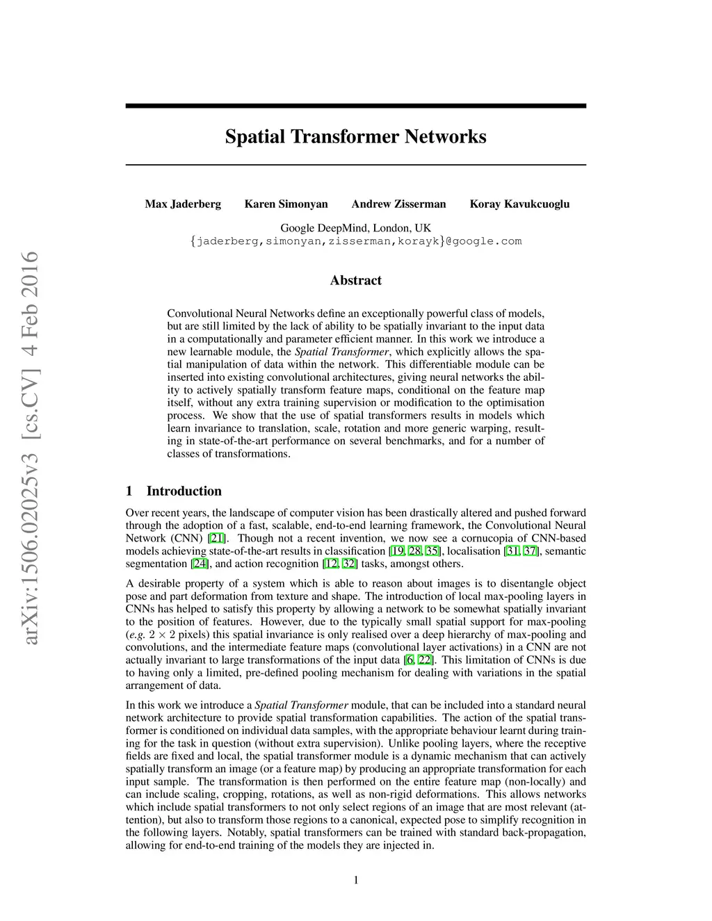 Convolutional Neural Networks define an exceptionally powerful class of models, but are still limited by the lack of ability to be spatially invariant to the input data in a computationally and parameter efficient manner. In this work we introduce a new learnable module, the Spatial Transformer, which explicitly allows the spatial manipulation of data within the network. This differentiable module can be inserted into existing convolutional architectures, giving neural networks the ability to actively spatially transform feature maps, conditional on the feature map itself, without any extra training supervision or modification to the optimisation process. We show that the use of spatial transformers results in models which learn invariance to translation, scale, rotation and more generic warping, resulting in state-of-the-art performance on several benchmarks, and for a number of classes of transformations.