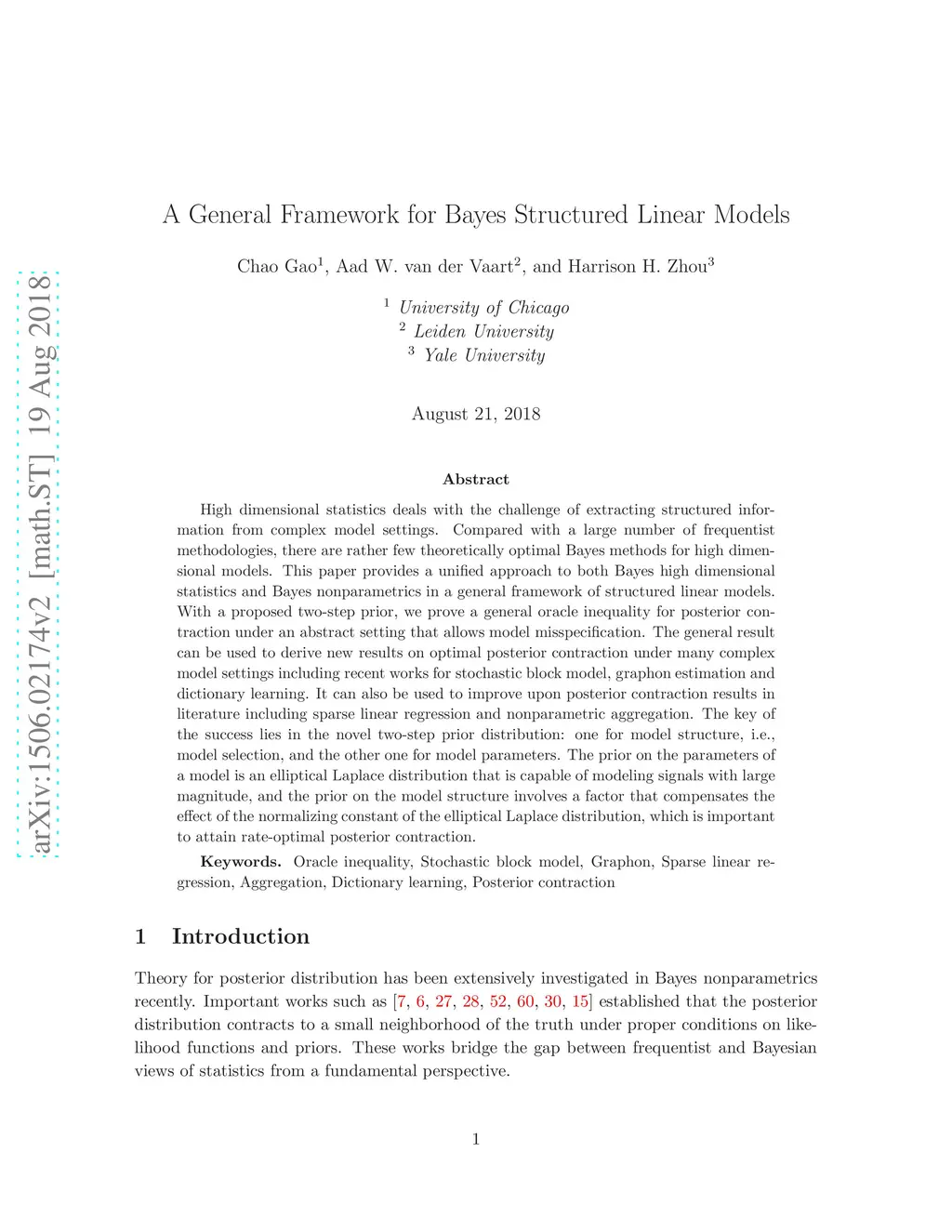 High dimensional statistics deals with the challenge of extracting structured information from complex model settings. Compared with the growing number of frequentist methodologies, there are rather few theoretically optimal Bayes methods that can deal with very general high dimensional models. In contrast, Bayes methods have been extensively studied in various nonparametric settings and rate optimal posterior contraction results have been established. This paper provides a unified approach to both Bayes high dimensional statistics and Bayes nonparametrics in a general framework of structured linear models. With the proposed two-step model selection prior, we prove a general theorem of posterior contraction under an abstract setting. The main theorem can be used to derive new results on optimal posterior contraction under many complex model settings including stochastic block model, graphon estimation and dictionary learning. It can also be used to re-derive optimal posterior contraction for problems such as sparse linear regression and nonparametric aggregation, which improve upon previous Bayes results for these problems. The key of the success lies in the proposed two-step prior distribution. The prior on the parameters is an elliptical Laplace distribution that is capable to model signals with large magnitude, and the prior on the models involves an important correction factor that compensates the effect of the normalizing constant of the elliptical Laplace distribution.