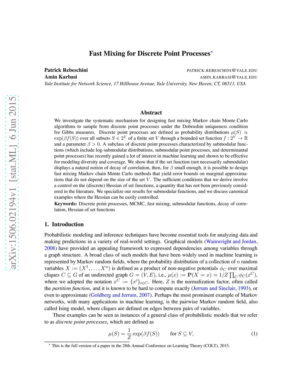 We investigate the systematic mechanism for designing fast mixing Markov chain Monte Carlo algorithms to sample from discrete point processes under the Dobrushin uniqueness condition for Gibbs measures. Discrete point processes are defined as probability distributions over all subsets of a finite set through a bounded set function and a parameter . A subclass of discrete point processes characterized by submodular functions (which include log-submodular distributions, submodular point processes, and determinantal point processes) has recently gained a lot of interest in machine learning and shown to be effective for modeling diversity and coverage. We show that if the set function (not necessarily submodular) displays a natural notion of decay of correlation, then, for small enough, it is possible to design fast mixing Markov chain Monte Carlo methods that yield error bounds on marginal approximations that do not depend on the size of the set . The sufficient conditions that we derive involve a control on the (discrete) Hessian of set functions, a quantity that has not been previously considered in the literature. We specialize our results for submodular functions, and we discuss canonical examples where the Hessian can be easily controlled.