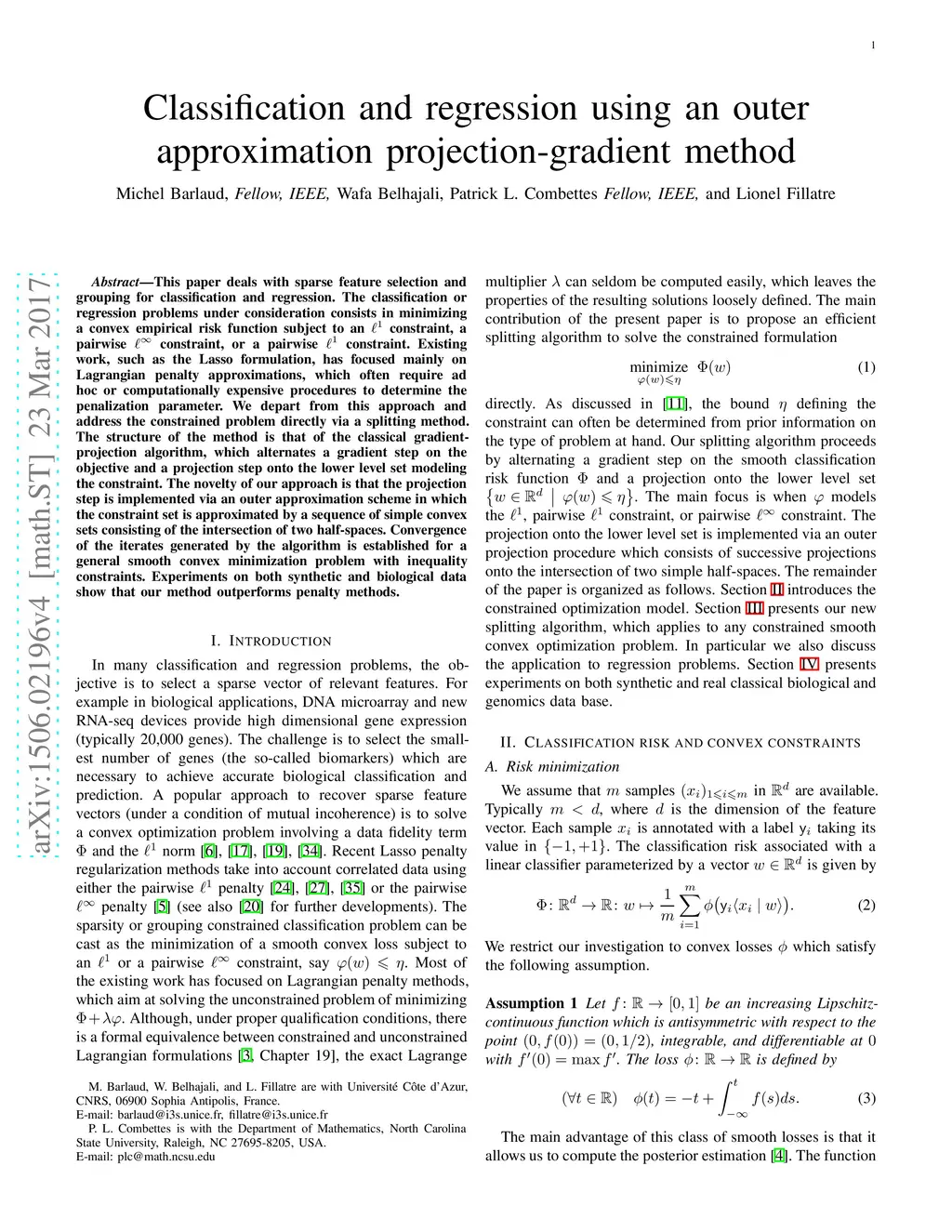 This paper deals with sparse feature selection and grouping for classification and regression. The classification or regression problems under consideration consists in minimizing a convex empirical risk function subject to an constraint, a pairwise constraint, or a pairwise constraint. Existing work, such as the Lasso formulation, has focused mainly on Lagrangian penalty approximations, which often require ad hoc or computationally expensive procedures to determine the relaxation parameter. We depart from this approach and address the constrained problem directly via a splitting method. The structure of the method is that of the classical gradient projection algorithm, which alternates a gradient step on the objective and a projection step onto the lower level set modeling the constraint. The novelty of our approach is that the projection step is implemented via an outer approximation scheme in which the constraint set is approximated by a sequence of simple convex sets consisting of the intersection of two half-spaces. Convergence of the iterates generated by the algorithm is established. Experiments on both synthetic and biological data show that the formulation using the pairwise constraint outperforms those using the pairwise and the constraint.