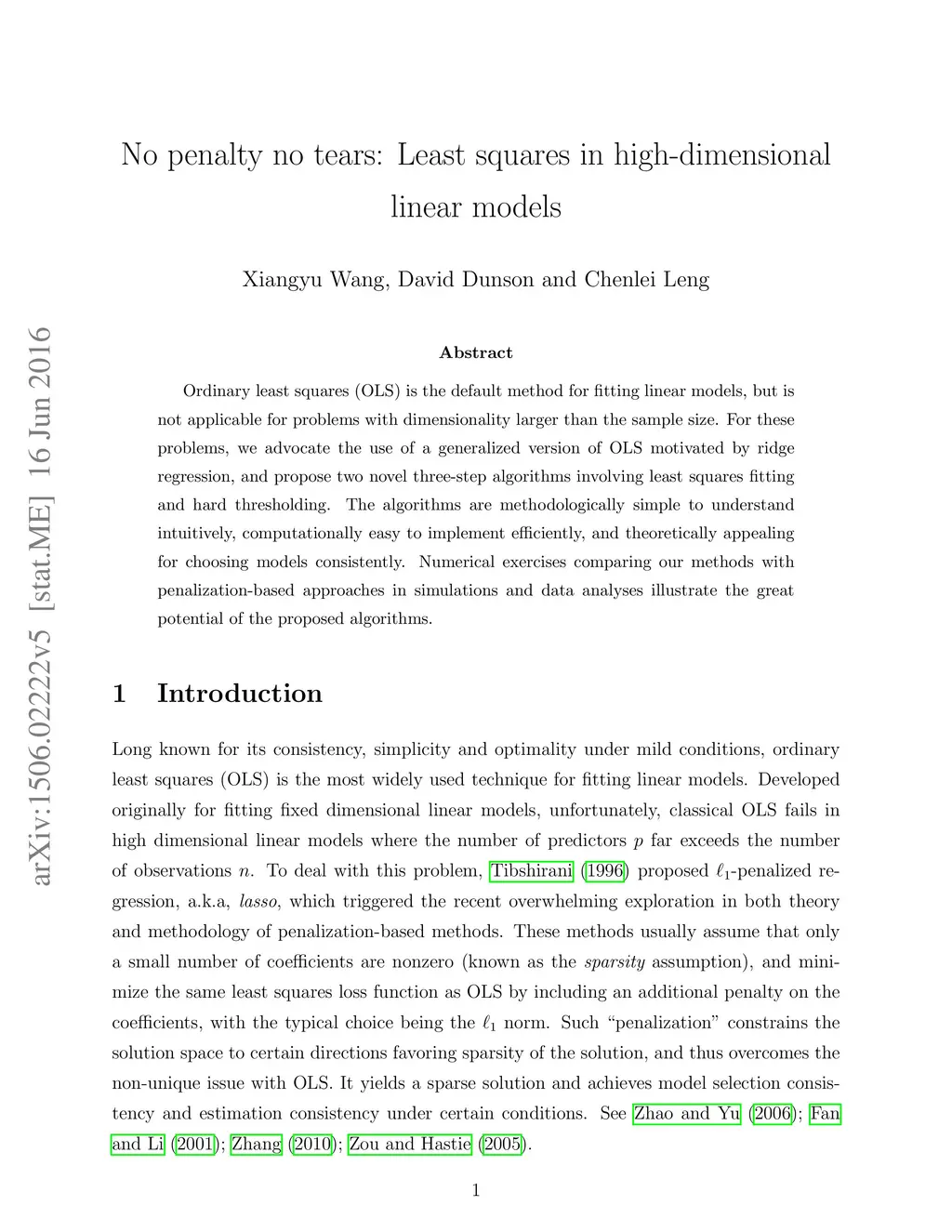 Ordinary least squares (OLS) is the default method for fitting linear models, but is not applicable for problems with dimensionality larger than the sample size. For these problems, we advocate the use of a generalized version of OLS motivated by ridge regression, and propose two novel three-step algorithms involving least squares fitting and hard thresholding. The algorithms are methodologically simple to understand intuitively, computationally easy to implement efficiently, and theoretically appealing for choosing models consistently. Numerical exercises comparing our methods with penalization-based approaches in simulations and data analyses illustrate the great potential of the proposed algorithms.