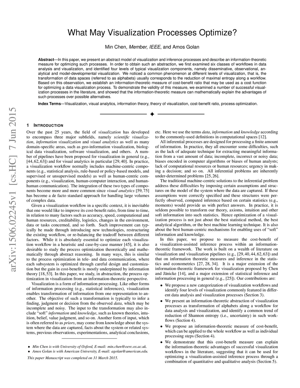 In this paper, we present an abstract model of visualization and inference processes and describe an information-theoretic measure for optimizing such processes. In order to obtain such an abstraction, we first examined six classes of workflows in data analysis and visualization, and identified four levels of typical visualization components, namely disseminative, observational, analytical and model-developmental visualization. We noticed a common phenomenon at different levels of visualization, that is, the transformation of data spaces (referred to as alphabets) usually corresponds to the reduction of maximal entropy along a workflow. Based on this observation, we establish an information-theoretic measure of cost-benefit ratio that may be used as a cost function for optimizing a data visualization process. To demonstrate the validity of this measure, we examined a number of successful visualization processes in the literature, and showed that the information-theoretic measure can mathematically explain the advantages of such processes over possible alternatives.
