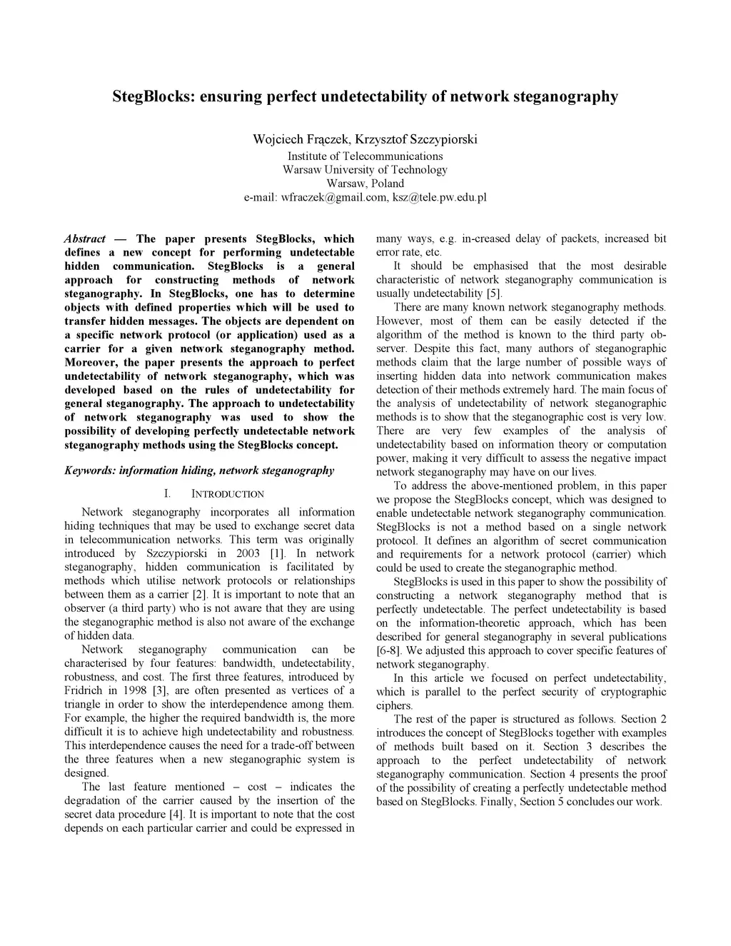 StegBlocks: ensuring perfect undetectability of network steganography