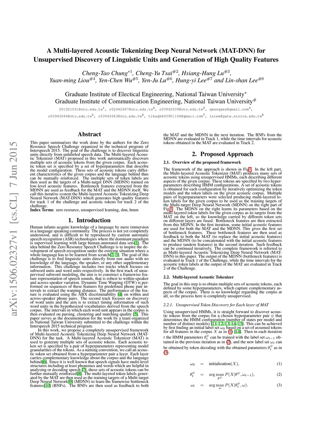 This paper summarizes the work done by the authors for the Zero Resource Speech Challenge organized in the technical program of Interspeech 2015. The goal of the challenge is to discover linguistic units directly from unlabeled speech data. The Multi-layered Acoustic Tokenizer (MAT) proposed in this work automatically discovers multiple sets of acoustic tokens from the given corpus. Each acoustic token set is specified by a set of hyperparameters that describe the model configuration. These sets of acoustic tokens carry different characteristics of the given corpus and the language behind thus can be mutually reinforced. The multiple sets of token labels are then used as the targets of a Multi-target DNN (MDNN) trained on low-level acoustic features. Bottleneck features extracted from the MDNN are used as feedback for the MAT and the MDNN itself. We call this iterative system the Multi-layered Acoustic Tokenizing Deep Neural Network (MAT-DNN) which generates high quality features for track 1 of the challenge and acoustic tokens for track 2 of the challenge.