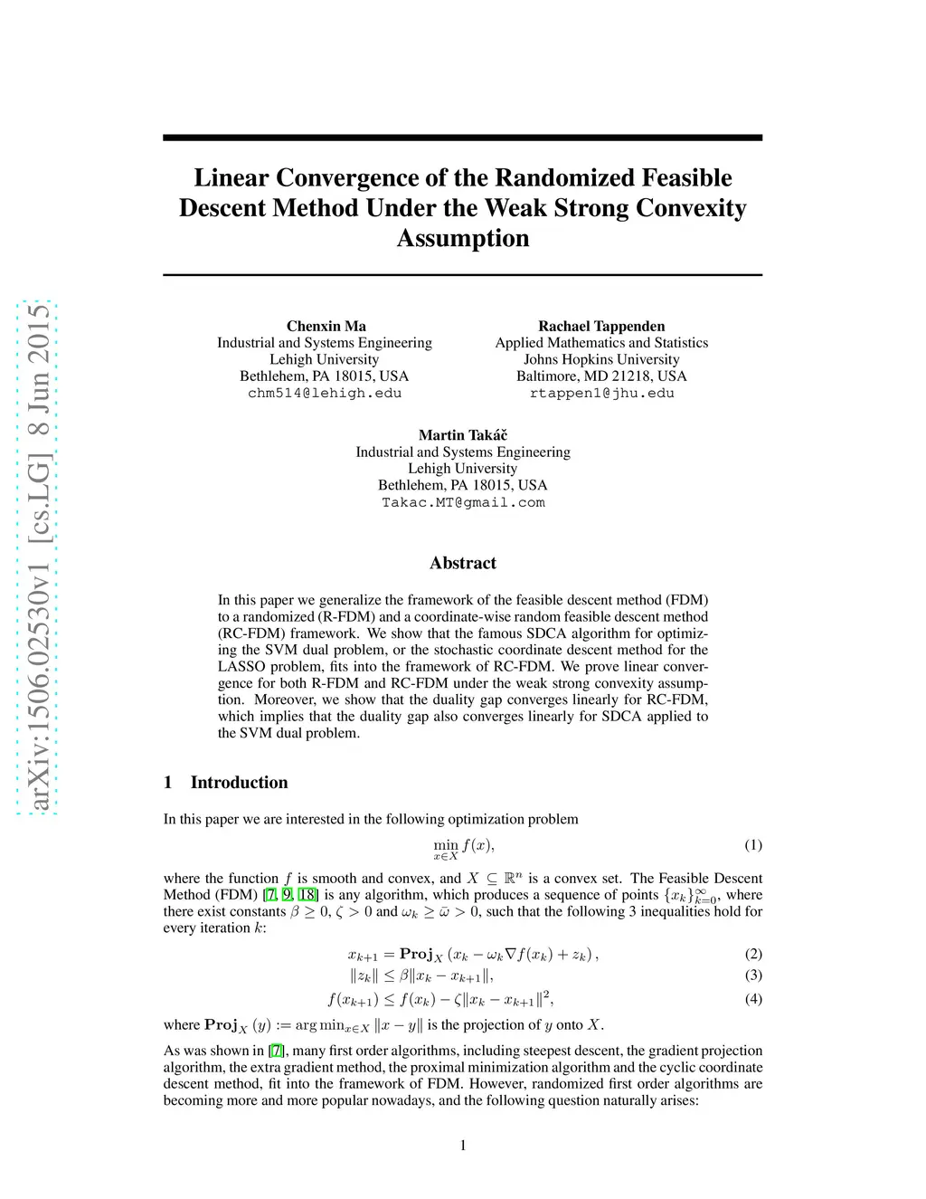 In this paper we generalize the framework of the feasible descent method (FDM) to a randomized (R-FDM) and a coordinate-wise random feasible descent method (RC-FDM) framework. We show that the famous SDCA algorithm for optimizing the SVM dual problem, or the stochastic coordinate descent method for the LASSO problem, fits into the framework of RC-FDM. We prove linear convergence for both R-FDM and RC-FDM under the weak strong convexity assumption. Moreover, we show that the duality gap converges linearly for RC-FDM, which implies that the duality gap also converges linearly for SDCA applied to the SVM dual problem.