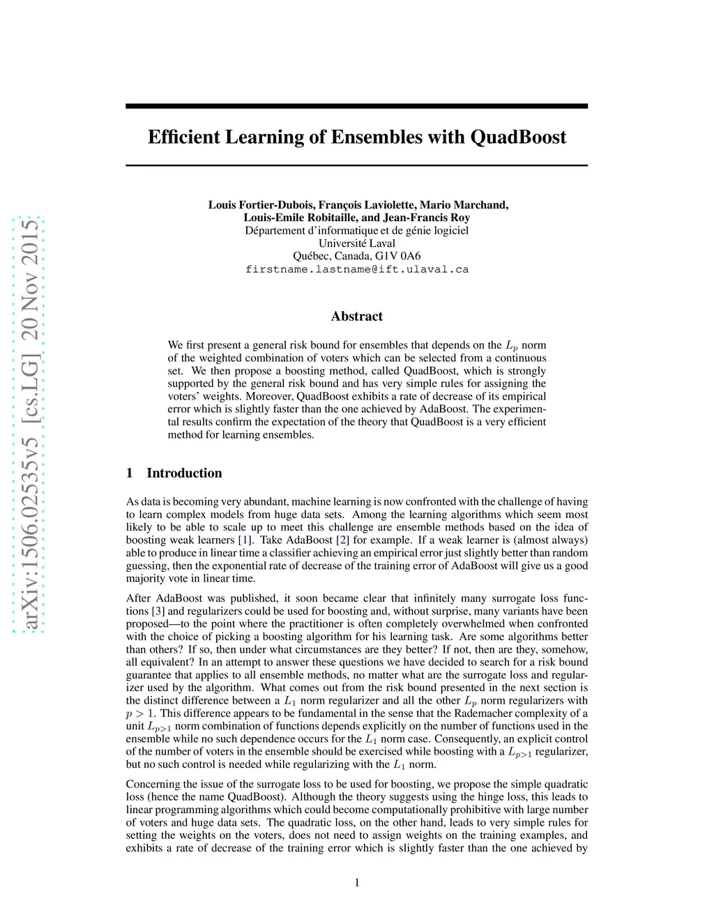 Efficient Learning of Ensembles with QuadBoost