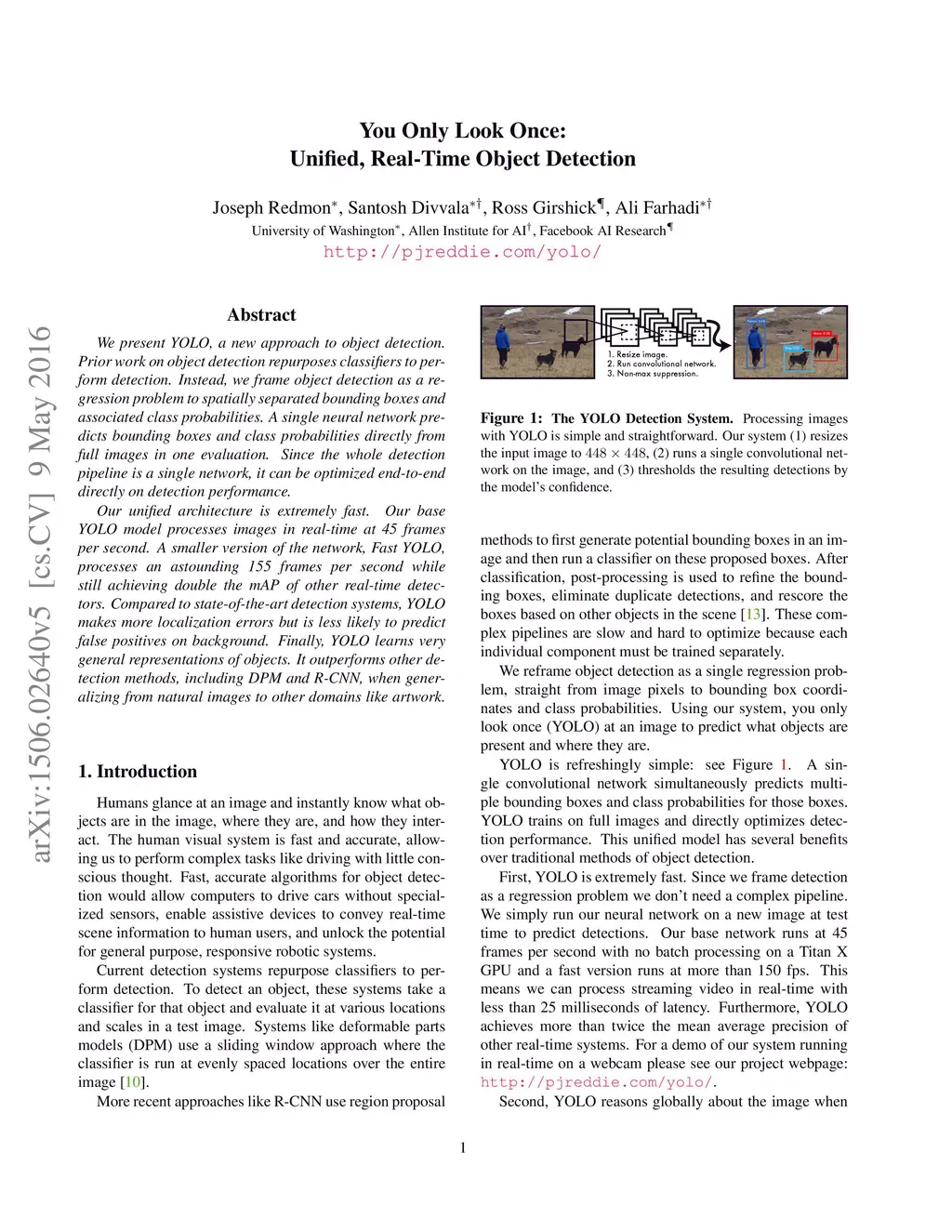 We present YOLO, a new approach to object detection. Prior work on object detection repurposes classifiers to perform detection. Instead, we frame object detection as a regression problem to spatially separated bounding boxes and associated class probabilities. A single neural network predicts bounding boxes and class probabilities directly from full images in one evaluation. Since the whole detection pipeline is a single network, it can be optimized end-to-end directly on detection performance. Our unified architecture is extremely fast. Our base YOLO model processes images in real-time at 45 frames per second. A smaller version of the network, Fast YOLO, processes an astounding 155 frames per second while still achieving double the mAP of other real-time detectors. Compared to state-of-the-art detection systems, YOLO makes more localization errors but is far less likely to predict false detections where nothing exists. Finally, YOLO learns very general representations of objects. It outperforms all other detection methods, including DPM and R-CNN, by a wide margin when generalizing from natural images to artwork on both the Picasso Dataset and the People-Art Dataset.