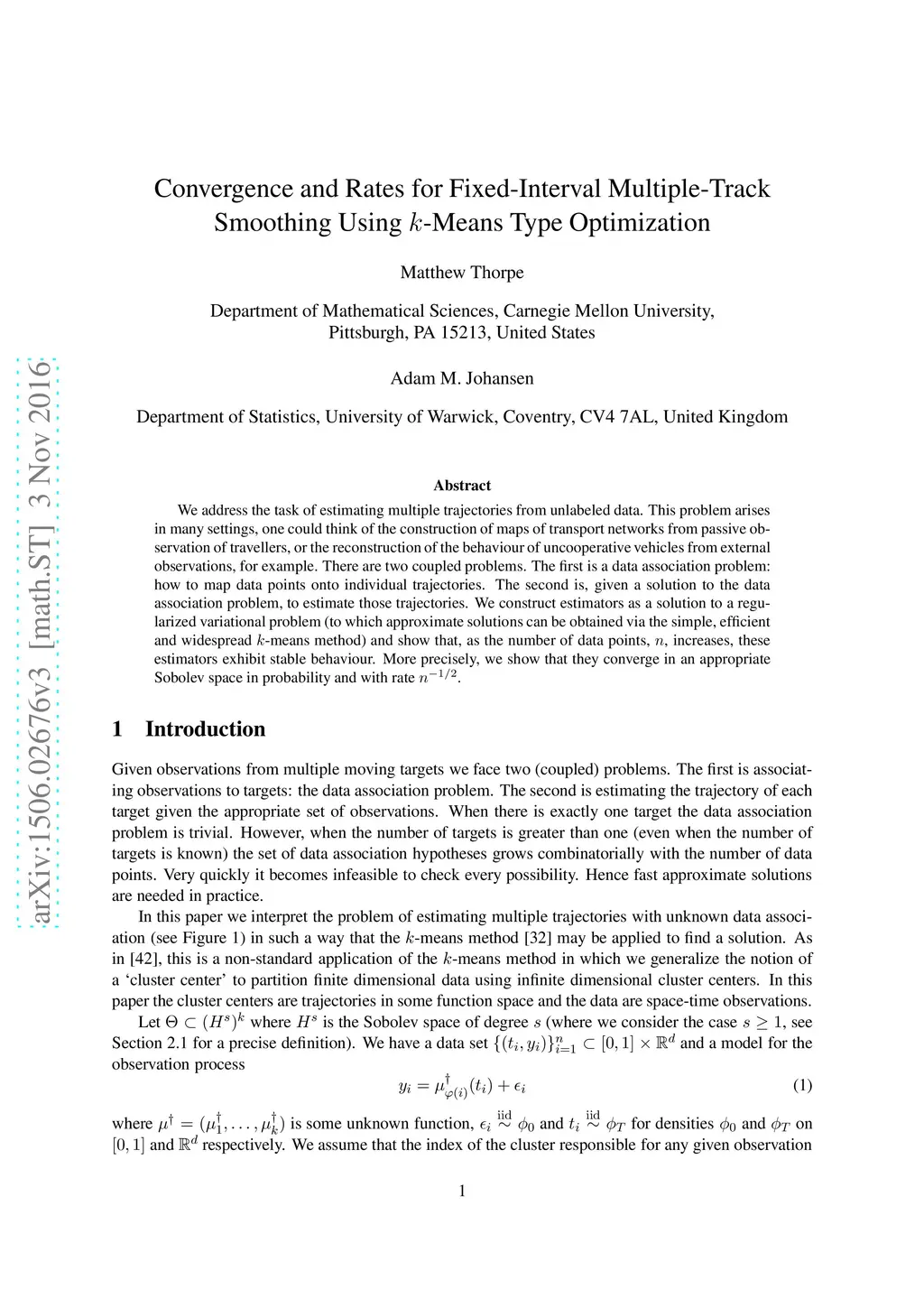 We address the task of estimating multiple trajectories from unlabeled data. This problem arises in many settings, one could think of the construction of maps of transport networks from passive observation of travellers, or the reconstruction of the behaviour of uncooperative vehicles from external observations, for example. There are two coupled problems. The first is a data association problem: how to map data points onto individual trajectories. The second is, given a solution to the data association problem, to estimate those trajectories. We construct estimators as a solution to a regularized variational problem (to which approximate solutions can be obtained via the simple, efficient and widespread -means method) and show that, as the number of data points, , increases, these estimators exhibit stable behaviour. More precisely, we show that they converge in an appropriate Sobolev space in probability and with rate .