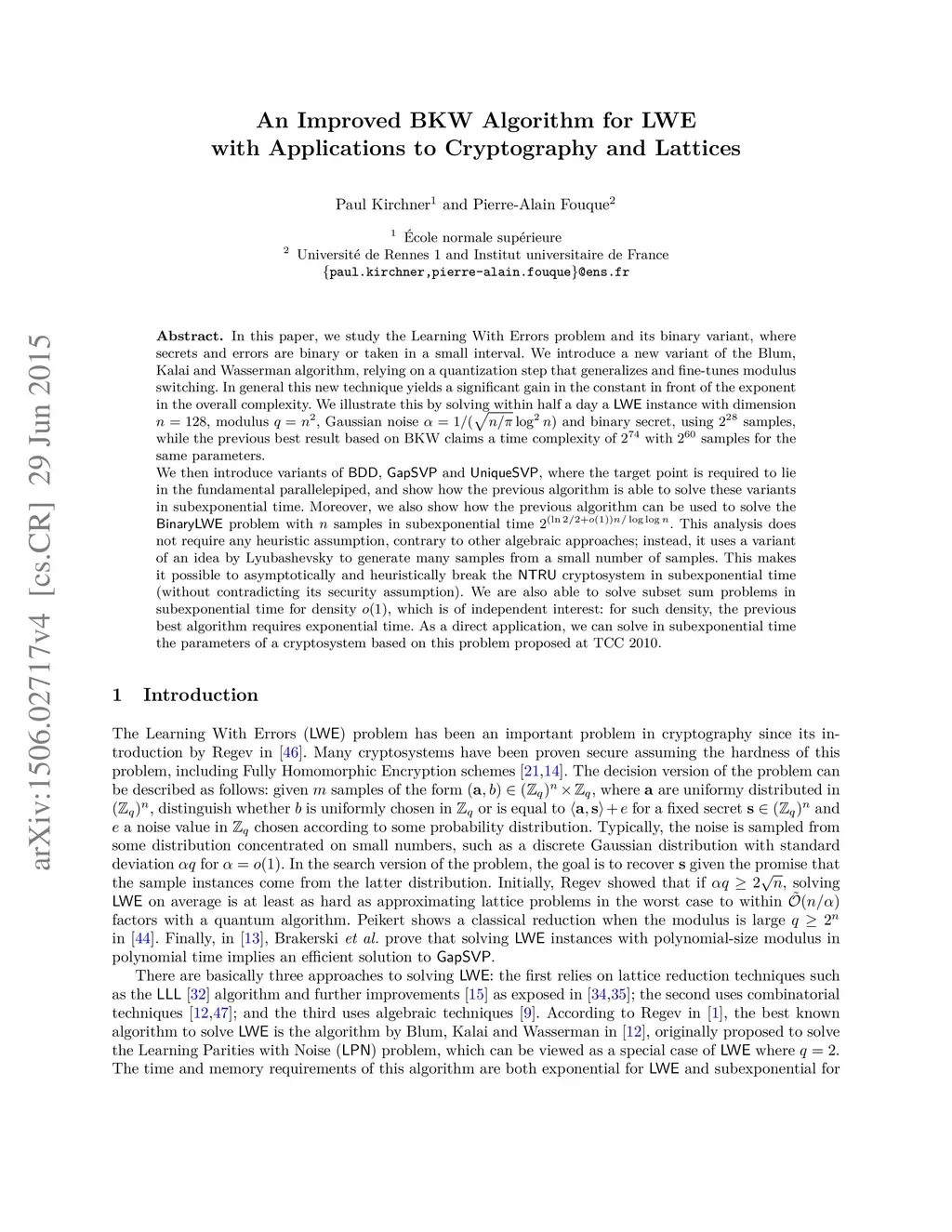 In this paper, we study the Learning With Errors problem and its binary variant, where secrets and errors are binary or taken in a small interval. We introduce a new variant of the Blum, Kalai and Wasserman algorithm, relying on a quantization step that generalizes and fine-tunes modulus switching. In general this new technique yields a significant gain in the constant in front of the exponent in the overall complexity. We illustrate this by solving p within half a day a LWE instance with dimension n = 128, modulus , Gaussian noise and binary secret, using samples, while the previous best result based on BKW claims a time complexity of with samples for the same parameters. We then introduce variants of BDD, GapSVP and UniqueSVP, where the target point is required to lie in the fundamental parallelepiped, and show how the previous algorithm is able to solve these variants in subexponential time. Moreover, we also show how the previous algorithm can be used to solve the BinaryLWE problem with n samples in subexponential time . This analysis does not require any heuristic assumption, contrary to other algebraic approaches; instead, it uses a variant of an idea by Lyubashevsky to generate many samples from a small number of samples. This makes it possible to asymptotically and heuristically break the NTRU cryptosystem in subexponential time (without contradicting its security assumption). We are also able to solve subset sum problems in subexponential time for density , which is of independent interest: for such density, the previous best algorithm requires exponential time. As a direct application, we can solve in subexponential time the parameters of a cryptosystem based on this problem proposed at TCC 2010.