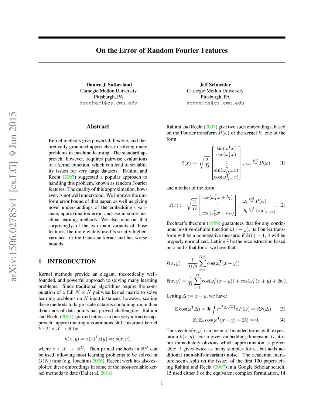 Kernel methods give powerful, flexible, and theoretically grounded approaches to solving many problems in machine learning. The standard approach, however, requires pairwise evaluations of a kernel function, which can lead to scalability issues for very large datasets. Rahimi and Recht (2007) suggested a popular approach to handling this problem, known as random Fourier features. The quality of this approximation, however, is not well understood. We improve the uniform error bound of that paper, as well as giving novel understandings of the embedding's variance, approximation error, and use in some machine learning methods. We also point out that surprisingly, of the two main variants of those features, the more widely used is strictly higher-variance for the Gaussian kernel and has worse bounds.