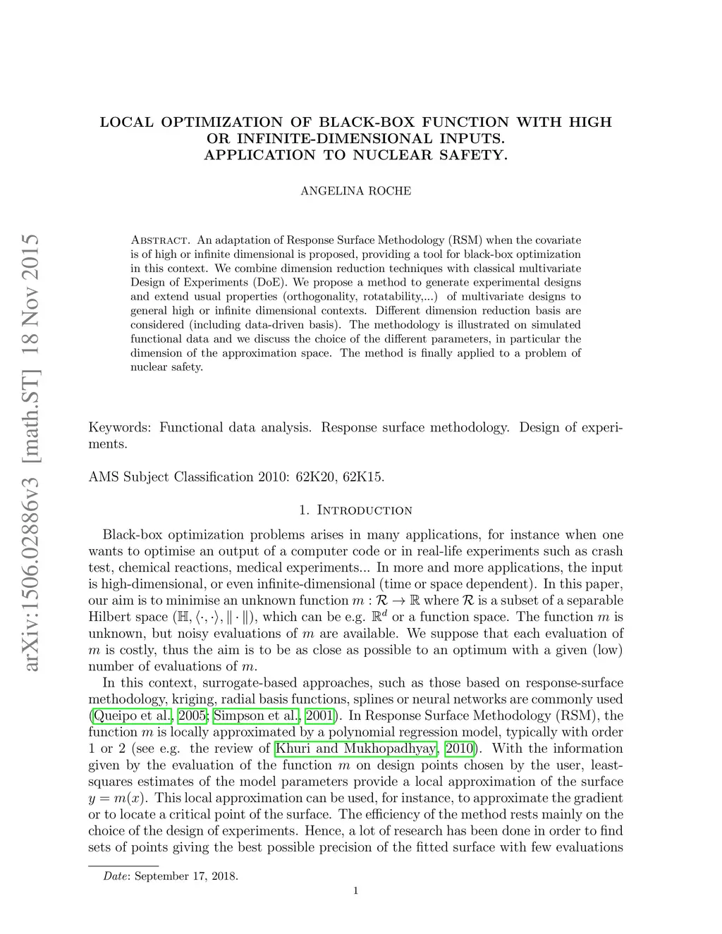 An adaptation of Response Surface Methodology (RSM) when the covariate is of high or infinite dimensional is proposed, providing a tool for black-box optimization in this context. We combine dimension reduction techniques with classical multivariate Design of Experiments (DoE). We propose a method to generate experimental designs and extend usual properties (orthogonality, rotatability,...) of multivariate designs to general high or infinite dimensional contexts. Different dimension reduction basis are considered (including data-driven basis). The methodology is illustrated on simulated functional data and we discuss the choice of the different parameters, in particular the dimension of the approximation space. The method is finally applied to a problem of nuclear safety.