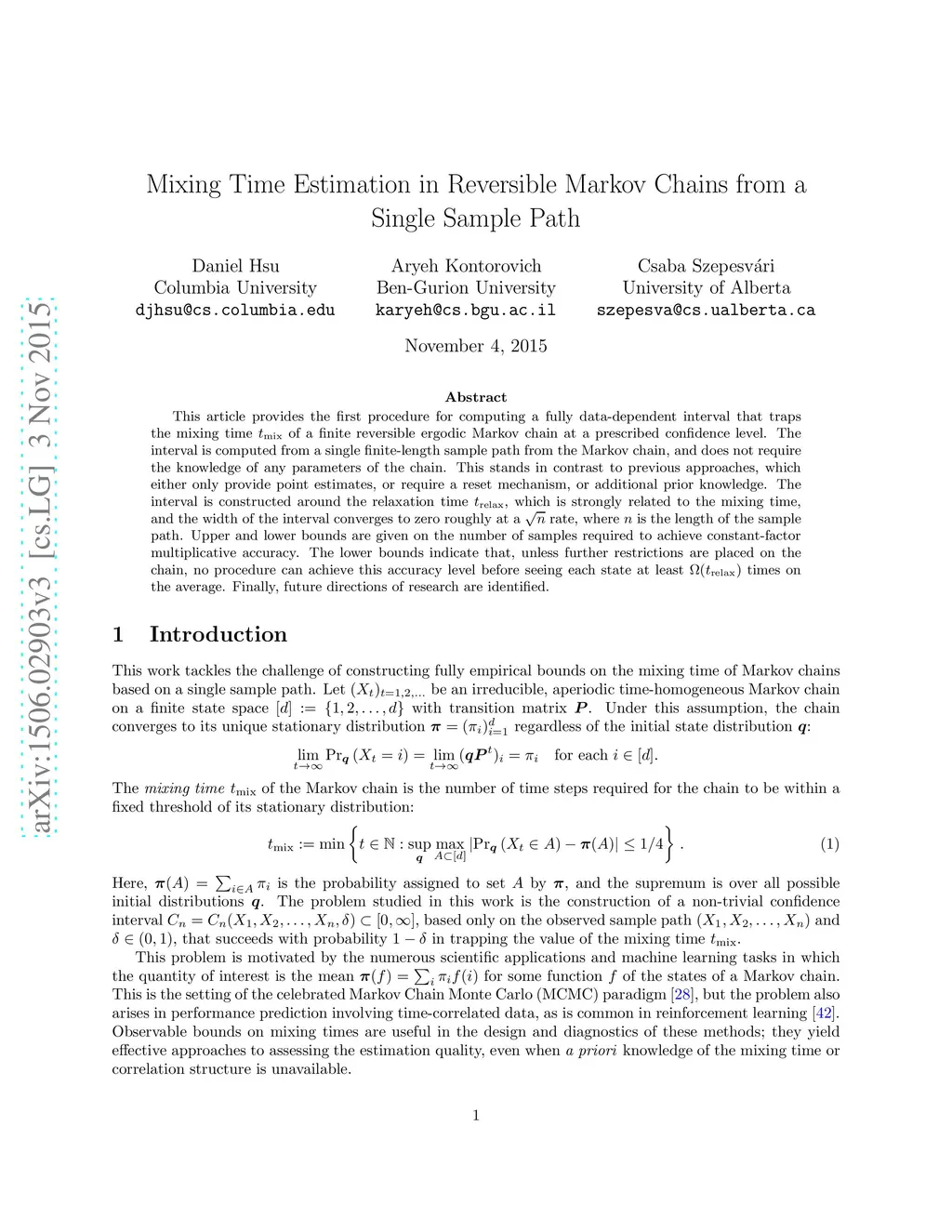 This article provides the first procedure for computing a fully data-dependent interval that traps the mixing time of a finite reversible ergodic Markov chain at a prescribed confidence level. The interval is computed from a single finite-length sample path from the Markov chain, and does not require the knowledge of any parameters of the chain. This stands in contrast to previous approaches, which either only provide point estimates, or require a reset mechanism, or additional prior knowledge. The interval is constructed around the relaxation time , which is strongly related to the mixing time, and the width of the interval converges to zero roughly at a rate, where is the length of the sample path. Upper and lower bounds are given on the number of samples required to achieve constant-factor multiplicative accuracy. The lower bounds indicate that, unless further restrictions are placed on the chain, no procedure can achieve this accuracy level before seeing each state at least times on the average. Finally, future directions of research are identified.