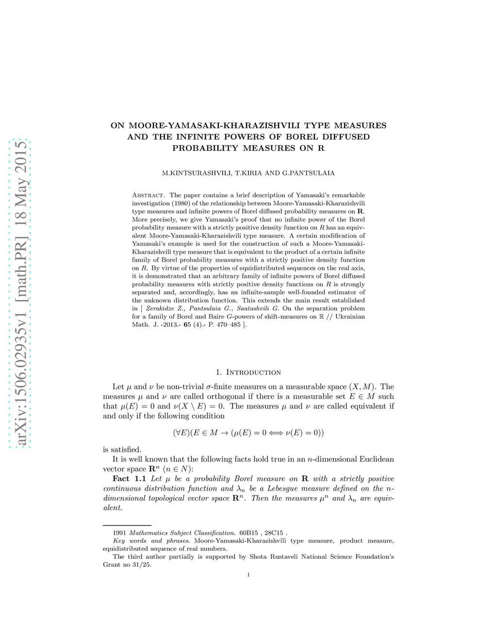 The paper contains a brief description of Yamasaki's remarkable investigation (1980) of the relationship between Moore-Yamasaki-Kharazishvili type measures and infinite powers of Borel diffused probability measures on . More precisely, we give Yamasaki's proof that no infinite power of the Borel probability measure with a strictly positive density function on has an equivalent Moore-Yamasaki-Kharazishvili type measure. A certain modification of Yamasaki's example is used for the construction of such a Moore-Yamasaki-Kharazishvili type measure that is equivalent to the product of a certain infinite family of Borel probability measures with a strictly positive density function on . By virtue of the properties of equidistributed sequences on the real axis, it is demonstrated that an arbitrary family of infinite powers of Borel diffused probability measures with strictly positive density functions on is strongly separated and, accordingly, has an infinite-sample well-founded estimator of the unknown distribution function. This extends the main result established in [ Zerakidze Z., Pantsulaia G., Saatashvili G. On the separation problem for a family of Borel and Baire -powers of shift-measures on // Ukrainian Math. J. -2013.-65 (4).- P. 470--485 ].