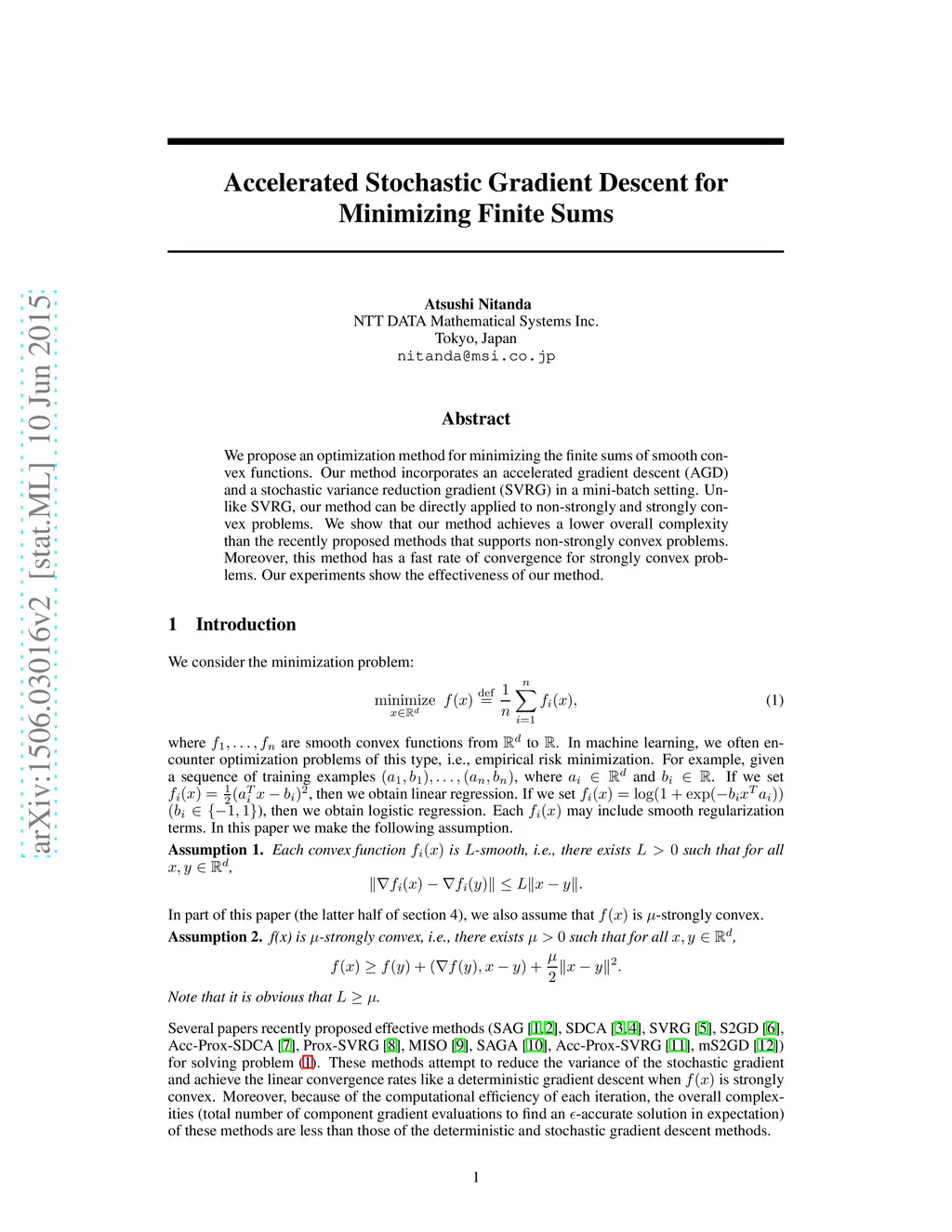We propose an optimization method for minimizing the finite sums of smooth convex functions. Our method incorporates an accelerated gradient descent (AGD) and a stochastic variance reduction gradient (SVRG) in a mini-batch setting. Unlike SVRG, our method can be directly applied to non-strongly and strongly convex problems. We show that our method achieves a lower overall complexity than the recently proposed methods that supports non-strongly convex problems. Moreover, this method has a fast rate of convergence for strongly convex problems. Our experiments show the effectiveness of our method.