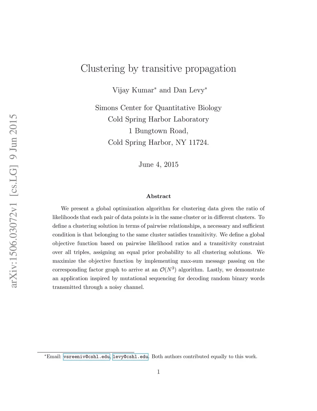 We present a global optimization algorithm for clustering data given the ratio of likelihoods that each pair of data points is in the same cluster or in different clusters. To define a clustering solution in terms of pairwise relationships, a necessary and sufficient condition is that belonging to the same cluster satisfies transitivity. We define a global objective function based on pairwise likelihood ratios and a transitivity constraint over all triples, assigning an equal prior probability to all clustering solutions. We maximize the objective function by implementing max-sum message passing on the corresponding factor graph to arrive at an O(N^3) algorithm. Lastly, we demonstrate an application inspired by mutational sequencing for decoding random binary words transmitted through a noisy channel.