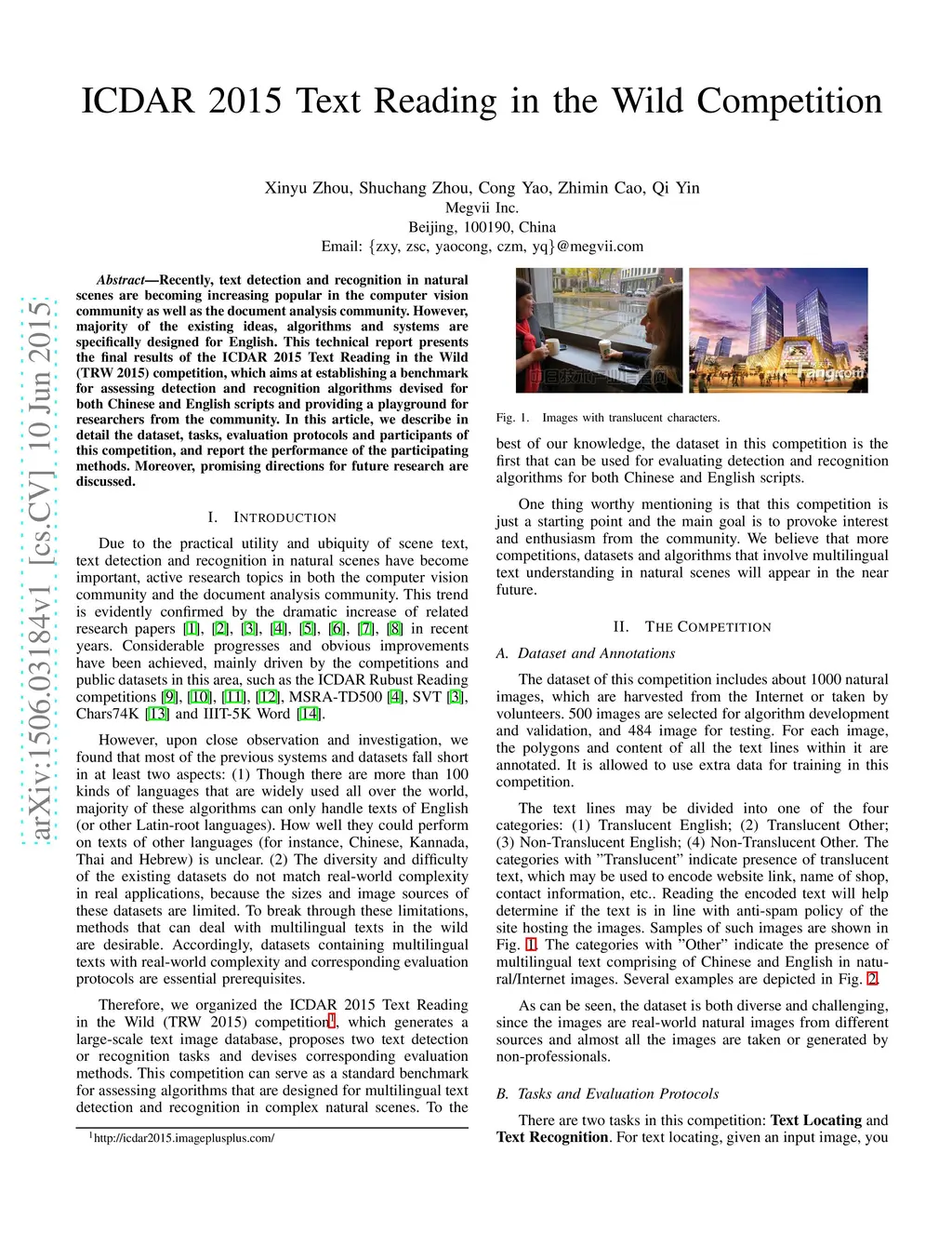 Recently, text detection and recognition in natural scenes are becoming increasing popular in the computer vision community as well as the document analysis community. However, majority of the existing ideas, algorithms and systems are specifically designed for English. This technical report presents the final results of the ICDAR 2015 Text Reading in the Wild (TRW 2015) competition, which aims at establishing a benchmark for assessing detection and recognition algorithms devised for both Chinese and English scripts and providing a playground for researchers from the community. In this article, we describe in detail the dataset, tasks, evaluation protocols and participants of this competition, and report the performance of the participating methods. Moreover, promising directions for future research are discussed.