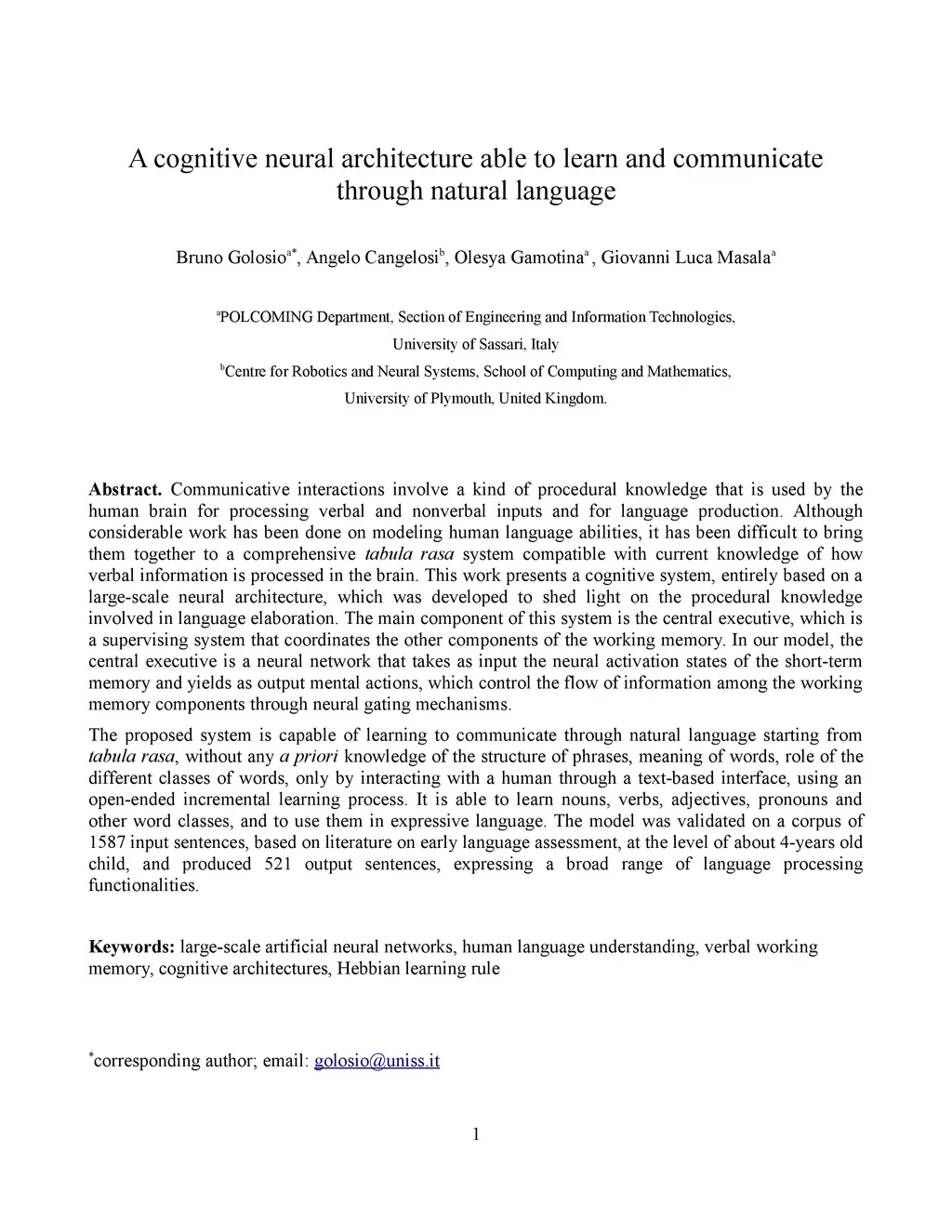 A cognitive neural architecture able to learn and communicate through