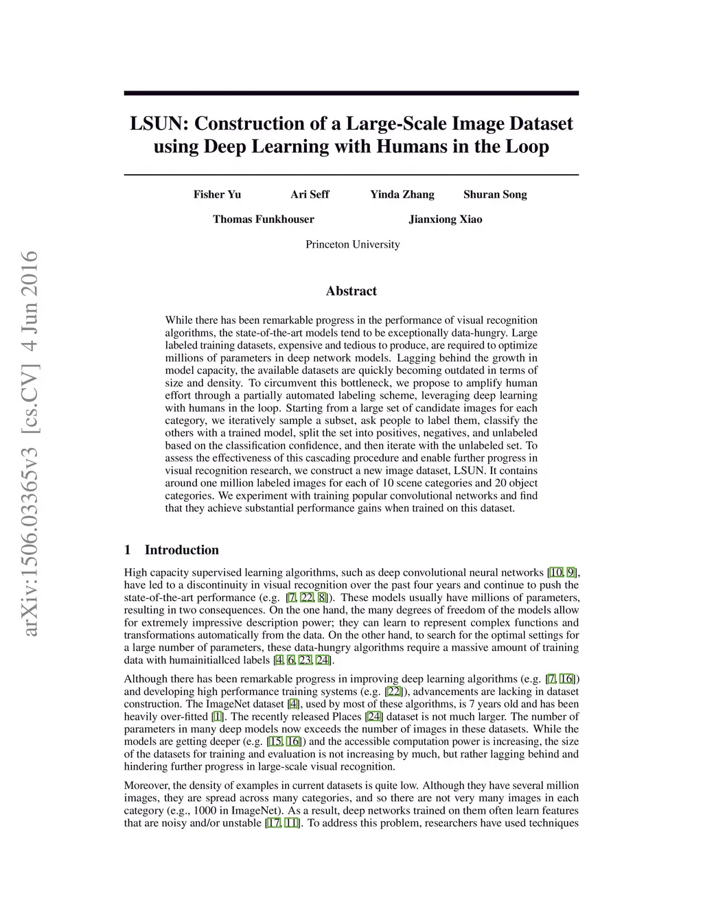While there has been remarkable progress in the performance of visual recognition algorithms, the state-of-the-art models tend to be exceptionally data-hungry. Large labeled training datasets, expensive and tedious to produce, are required to optimize millions of parameters in deep network models. Lagging behind the growth in model capacity, the available datasets are quickly becoming outdated in terms of size and density. To circumvent this bottleneck, we propose to amplify human effort through a partially automated labeling scheme, leveraging deep learning with humans in the loop. Starting from a large set of candidate images for each category, we iteratively sample a subset, ask people to label them, classify the others with a trained model, split the set into positives, negatives, and unlabeled based on the classification confidence, and then iterate with the unlabeled set. To assess the effectiveness of this cascading procedure and enable further progress in visual recognition research, we construct a new image dataset, LSUN. It contains around one million labeled images for each of 10 scene categories and 20 object categories. We experiment with training popular convolutional networks and find that they achieve substantial performance gains when trained on this dataset.
