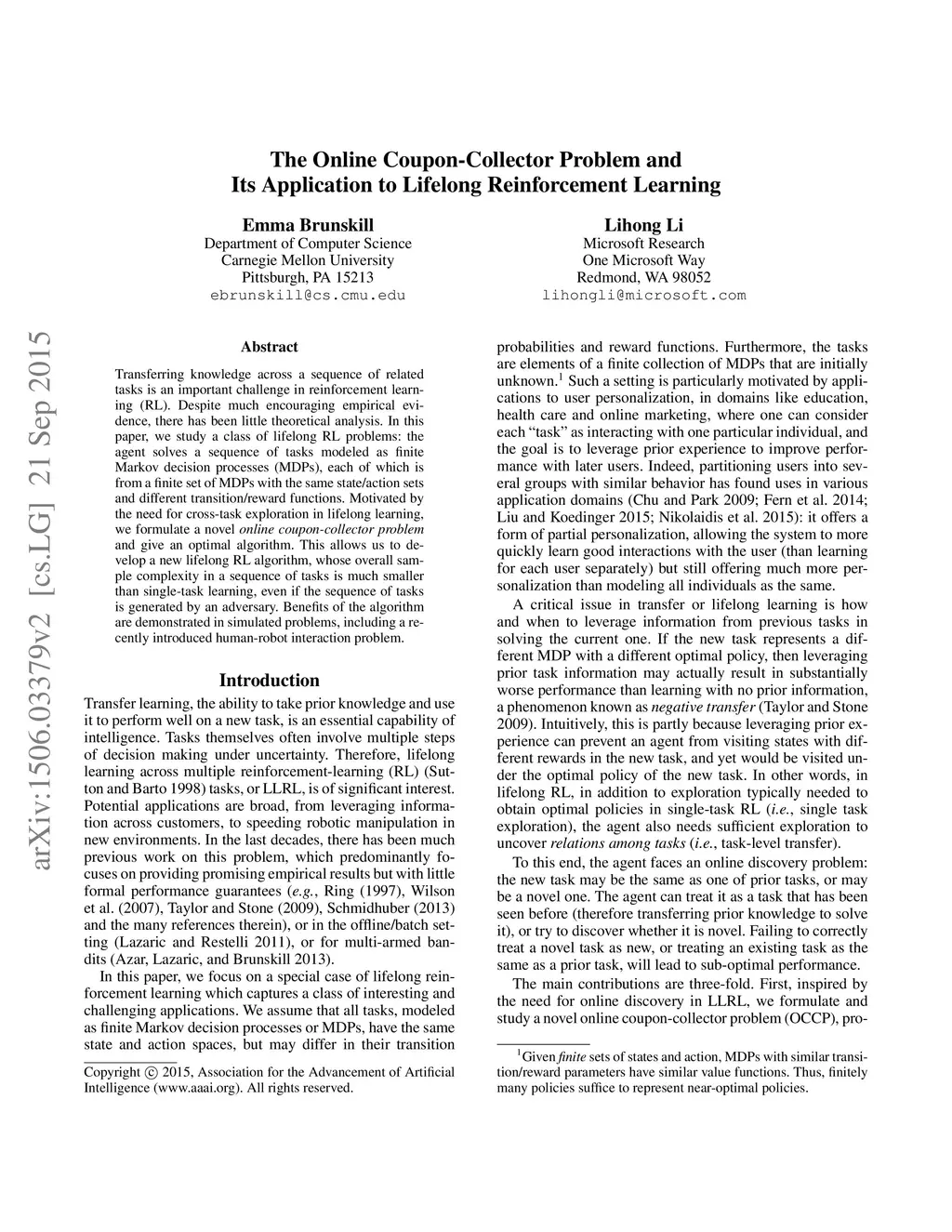 Transferring knowledge across a sequence of related tasks is an important challenge in reinforcement learning (RL). Despite much encouraging empirical evidence, there has been little theoretical analysis. In this paper, we study a class of lifelong RL problems: the agent solves a sequence of tasks modeled as finite Markov decision processes (MDPs), each of which is from a finite set of MDPs with the same state/action sets and different transition/reward functions. Motivated by the need for cross-task exploration in lifelong learning, we formulate a novel online coupon-collector problem and give an optimal algorithm. This allows us to develop a new lifelong RL algorithm, whose overall sample complexity in a sequence of tasks is much smaller than single-task learning, even if the sequence of tasks is generated by an adversary. Benefits of the algorithm are demonstrated in simulated problems, including a recently introduced human-robot interaction problem.