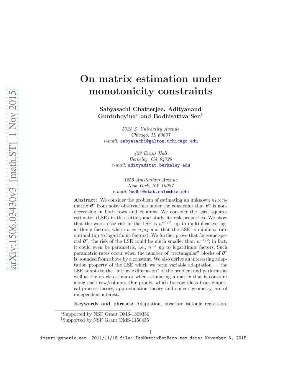 We consider the problem of estimating an unknown matrix from noisy observations under the constraint that is nondecreasing in both rows and columns. We consider the least squares estimator (LSE) in this setting and study its risk properties. We show that the worst case risk of the LSE is , up to multiplicative logarithmic factors, where and that the LSE is minimax rate optimal (up to logarithmic factors). We further prove that for some special , the risk of the LSE could be much smaller than ; in fact, it could even be parametric i.e., up to logarithmic factors. Such parametric rates occur when the number of "rectangular" blocks of is bounded from above by a constant. We derive, as a consequence, an interesting adaptation property of the LSE which we term variable adaptation -- the LSE performs as well as the oracle estimator when estimating a matrix that is constant along each row/column. Our proofs borrow ideas from empirical process theory and convex geometry and are of independent interest.