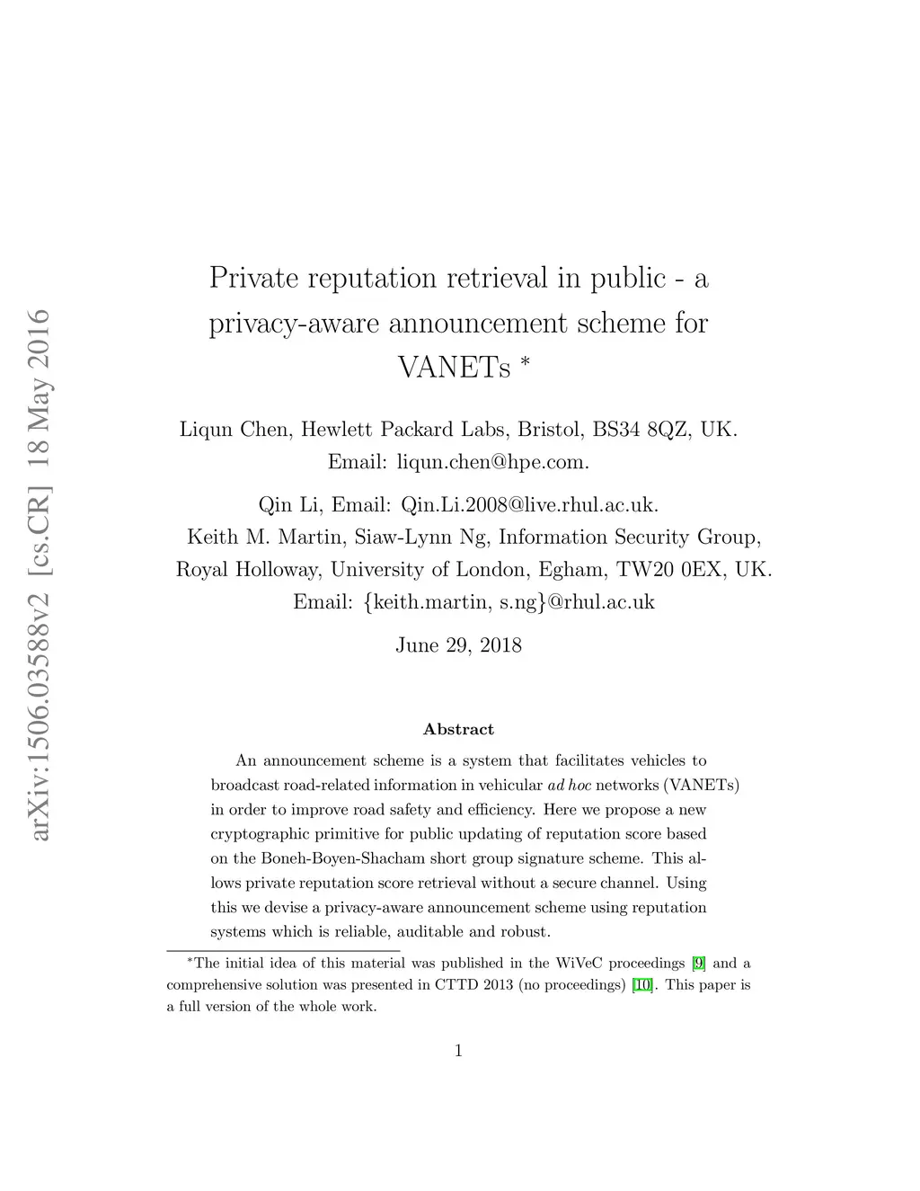 An announcement scheme is a system that facilitates vehicles to broadcast road-related information in vehicular ad hoc networks (VANETs) in order to improve road safety and efficiency. Here we propose a new cryptographic primitive for public updating of reputation score based on the Boneh-Boyen-Shacham short group signature scheme. This allows private reputation score retrieval without a secure channel. Using this we devise a privacy-aware announcement scheme using reputation systems which is reliable, auditable and robust.
