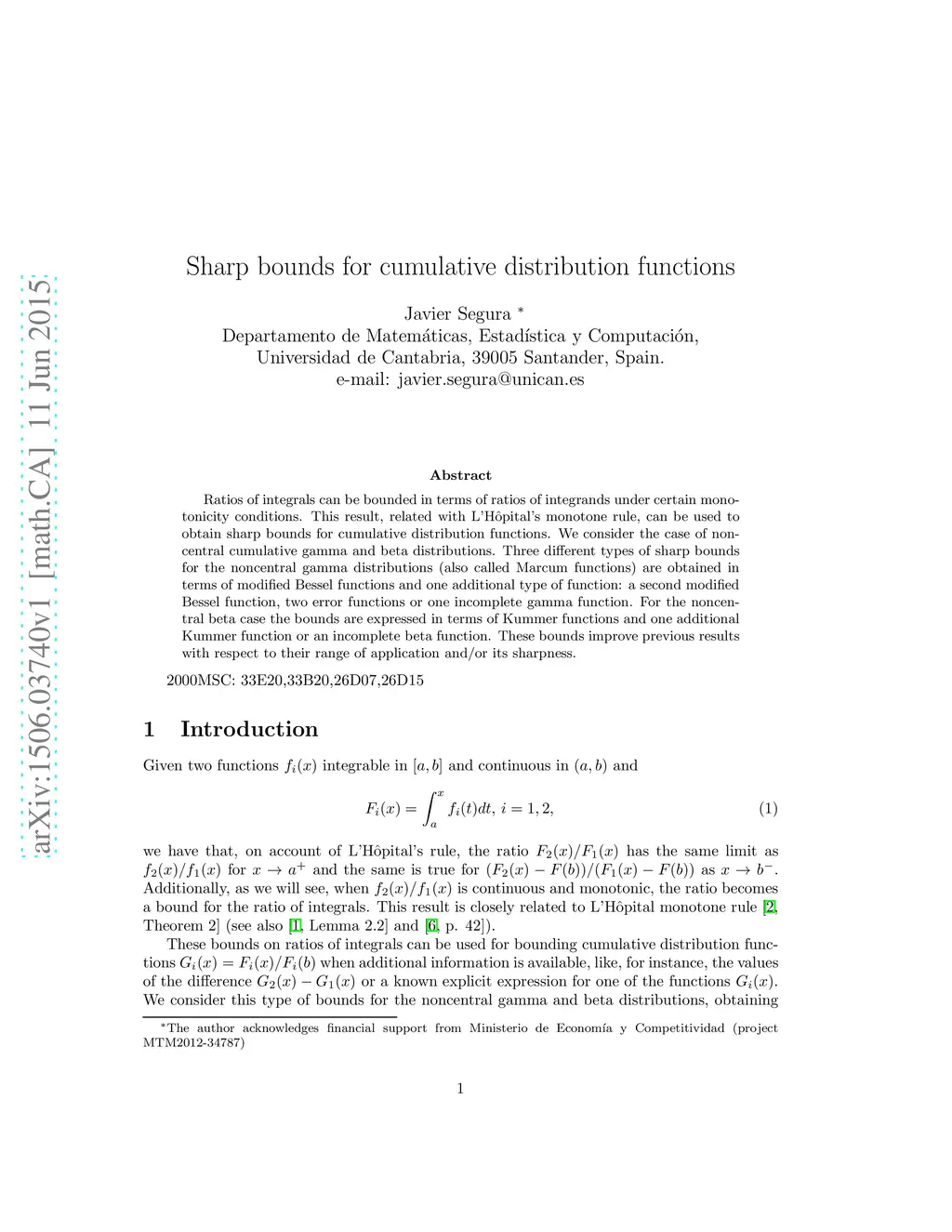 Ratios of integrals can be bounded in terms of ratios of integrands under certain monotonicity conditions. This result, related with L'H\^{o}pital's monotone rule, can be used to obtain sharp bounds for cumulative distribution functions. We consider the case of noncentral cumulative gamma and beta distributions. Three different types of sharp bounds for the noncentral gamma distributions (also called Marcum functions) are obtained in terms of modified Bessel functions and one additional type of function: a second modified Bessel function, two error functions or one incomplete gamma function. For the noncentral beta case the bounds are expressed in terms of Kummer functions and one additional Kummer function or an incomplete beta function. These bounds improve previous results with respect to their range of application and/or its sharpness.