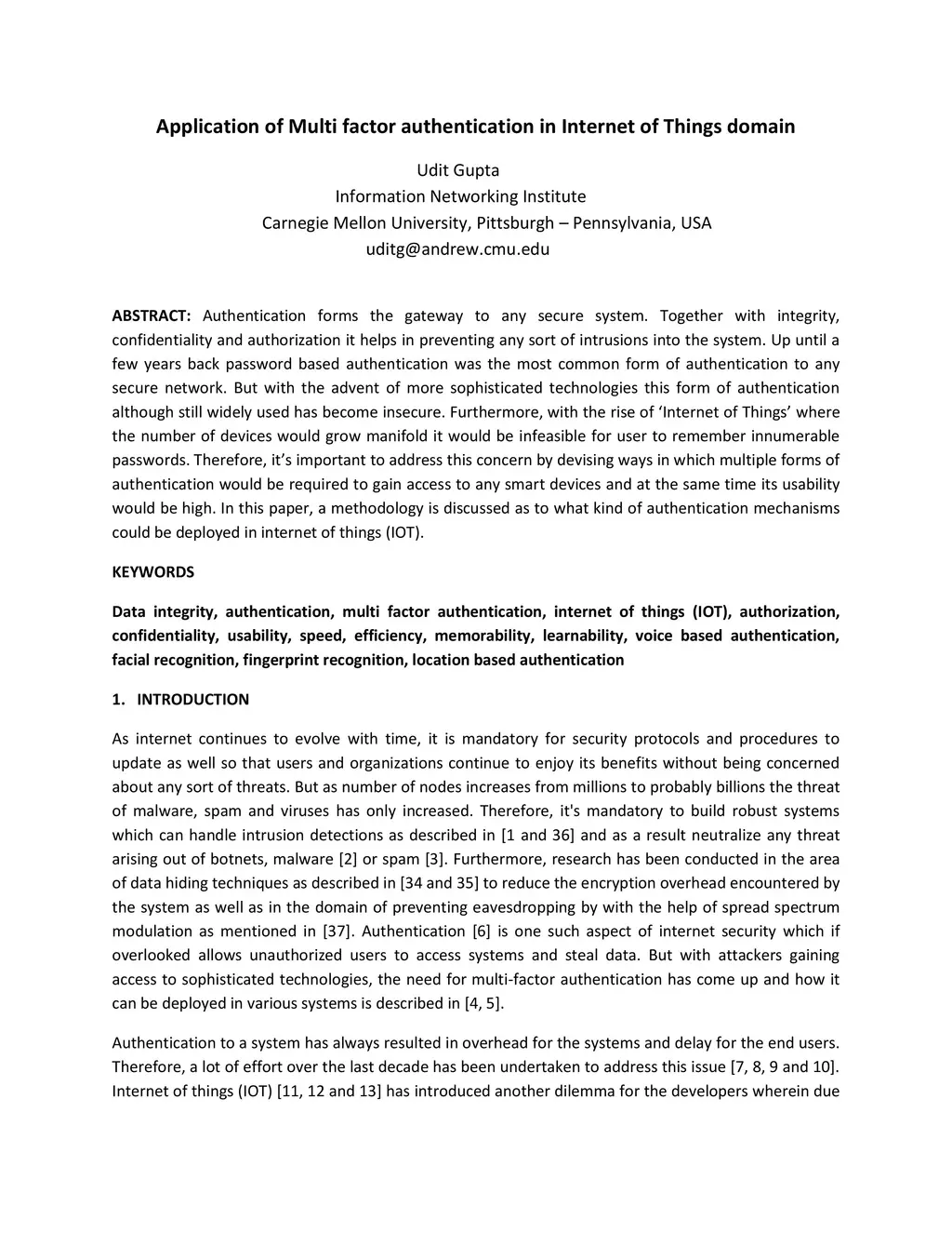Authentication forms the gateway to any secure system. Together with integrity, confidentiality and authorization it helps in preventing any sort of intrusions into the system. Up until a few years back password based authentication was the most common form of authentication to any secure network. But with the advent of more sophisticated technologies this form of authentication although still widely used has become insecure. Furthermore, with the rise of Ínternet of Things' where the number of devices would grow manifold it would be infeasible for user to remember innumerable passwords. Therefore, it's important to address this concern by devising ways in which multiple forms of authentication would be required to gain access to any smart devices and at the same time its usability would be high. In this paper, a methodology is discussed as to what kind of authentication mechanisms could be deployed in internet of things (IOT).