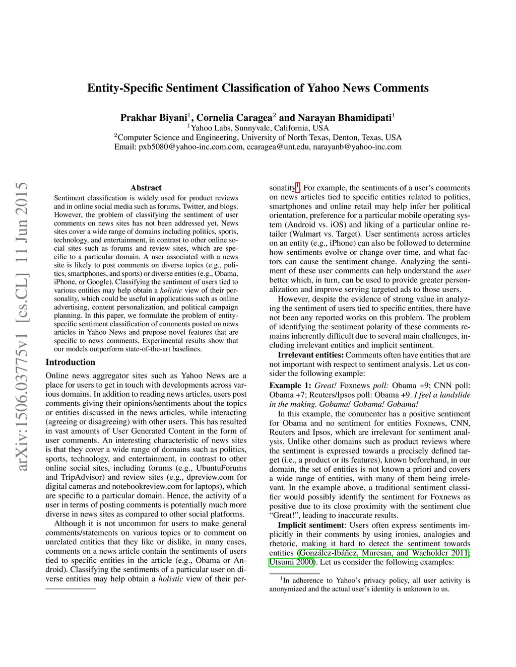 Entity-Specific Sentiment Classification of Yahoo News Comments