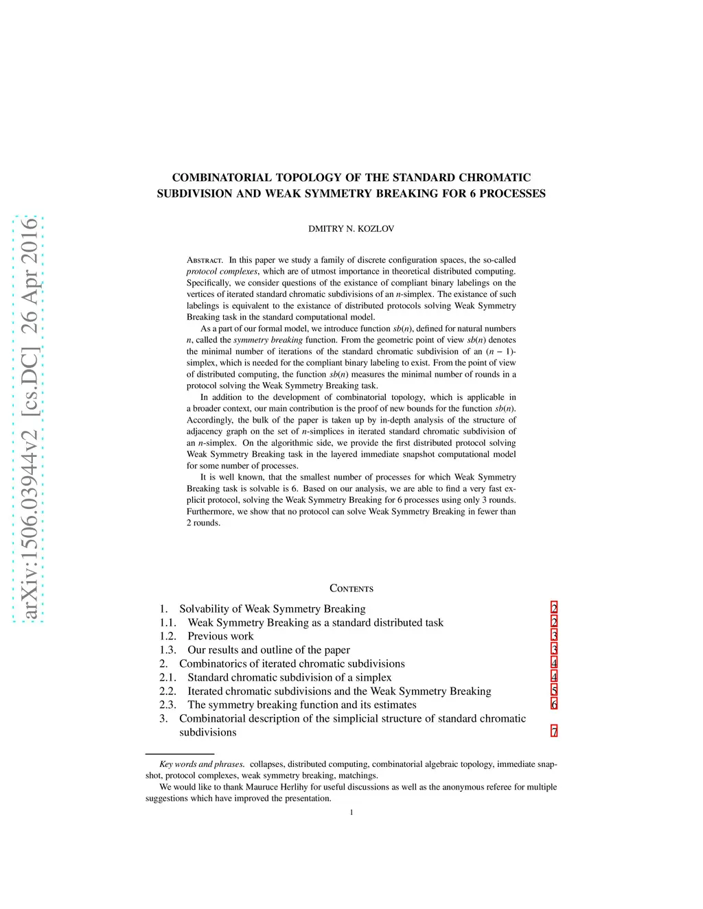 In this paper we study a family of discrete configuration spaces, the so-called protocol complexes, which are of utmost importance in theoretical distributed computing. Specifically, we consider questions of the existance of compliant binary labelings on the vertices of iterated standard chromatic subdivisions of an n-simplex. The existance of such labelings is equivalent to the existance of distributed protocols solving Weak Symmetry Breaking task in the standard computational model. As a part of our formal model, we introduce function sb(n), defined for natural numbers n, called the symmetry breaking function. From the geometric point of view sb(n) denotes the minimal number of iterations of the standard chromatic subdivision of an (n-1)-simplex, which is needed for the compliant binary labeling to exist. From the point of distributed computing, the function sb(n) measures the minimal number of rounds in a protocol solving the Weak Symmetry Breaking task. In addition to the development of combinatorial topology, which is applicable in a broader context, our main contribution is the proof of new bounds for the function sb(n). Accordingly, the bulk of the paper is taken up by in-depth analysis of the structure of adjacency graph on the set of n-simplices in iterated standard chromatic subdivision of an n-simplex. On the algorithmic side, we provide the first distributed protocol solving Weak Symmetry Breaking task in the layered immediate snapshot computational model for some number of processes. It is well known, that the smallest number of processes for which Weak Symmetry Breaking task is solvable is 6. Based on our analysis, we are able to find a very fast explicit protocol, solving the Weak Symmetry Breaking for 6 processes using only 3 rounds. Furthermore, we show that no protocol can solve Weak Symmetry Breaking in fewer than 2 rounds.