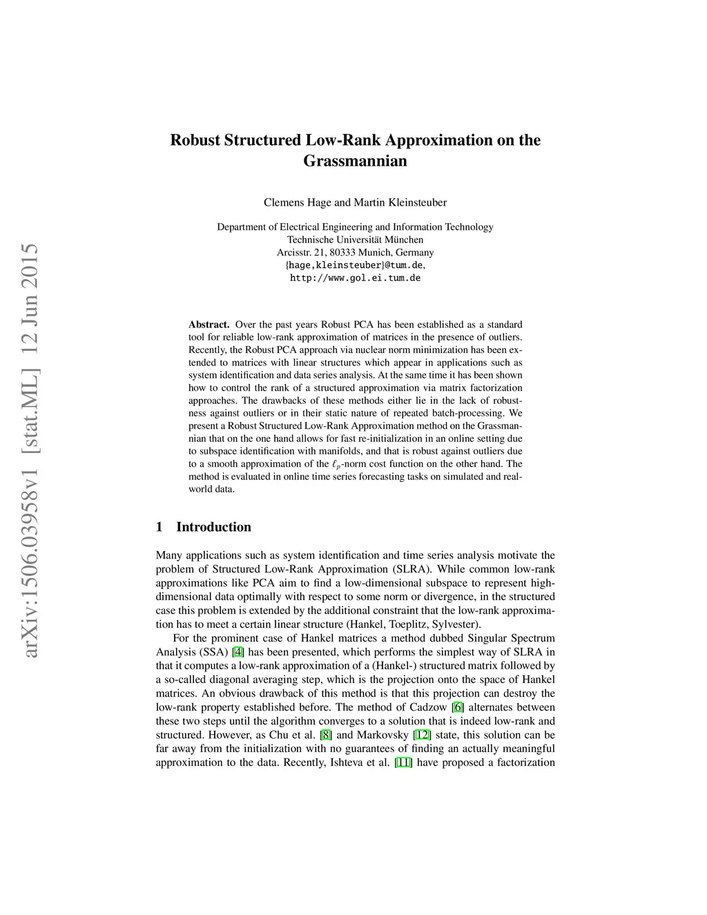 Robust Structured Low-Rank Approximation on the Grassmannian